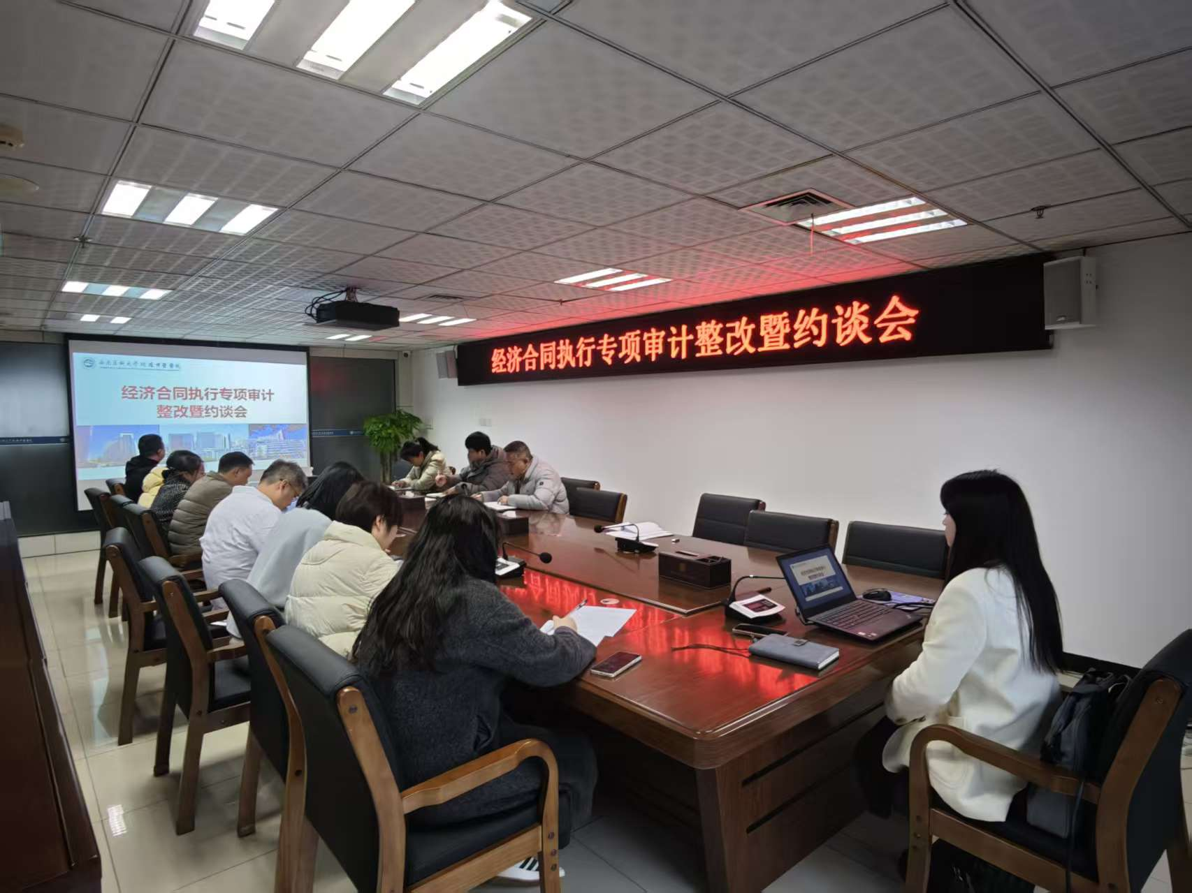 12月24日,我院召开了经济合同执行专项审计整改暨约谈会,审计组以及相关被审计部门负责人参加了会议。会议由审计部部长黄浩主持。
