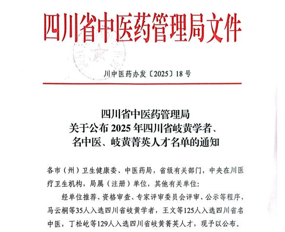近日,四川省中医药管理局发布了《关于公布2025年四川省岐黄学者、名中医、岐黄菁英人才名单的通知》。我院沈骅睿、罗钢、蒲清荣入选第二批四川省岐黄学者;王永周、古远云、江云东、江花、汪国友、张志鸿、潘洪入选第七批四川省名中医;邓淑霞、石厚银、关钛元、李艳、李静(肿瘤·血液病科)、张磊、罗琳、周兴玮入选第二批四川省岐黄菁英人才。