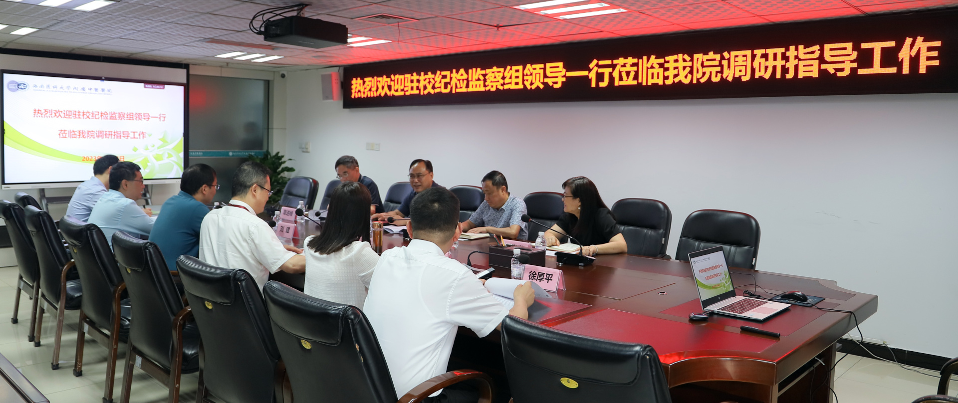 2023年5月24日,省纪委监委驻西南医科大学纪检监察组组长,学校党委委员、常委、副书记、纪委书记张永红一行莅临我院调研指导工作。我院党委书记李志,党委副书记、纪委书记徐茜及相关部门负责人等参加了座谈会。会议由李志主持。