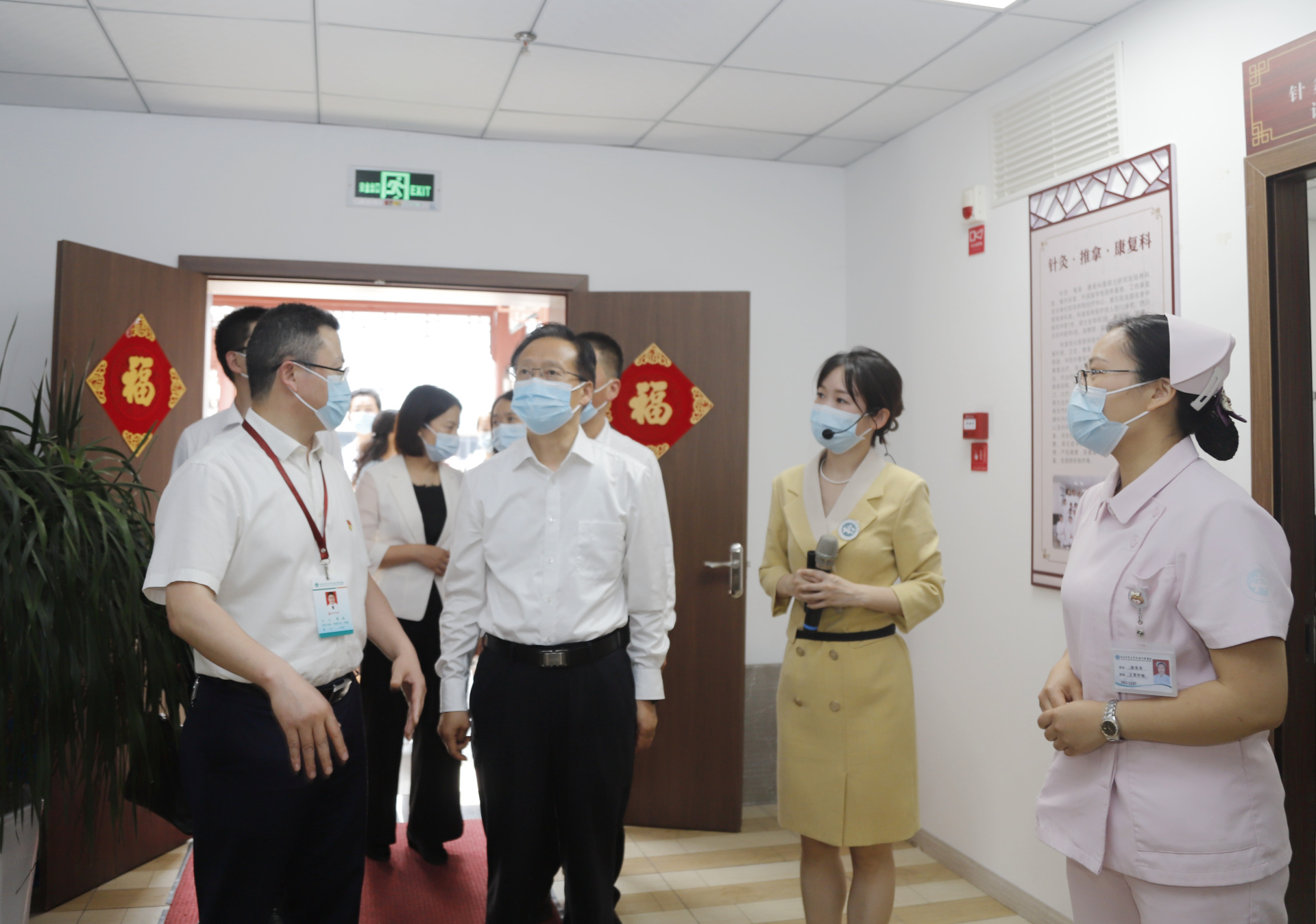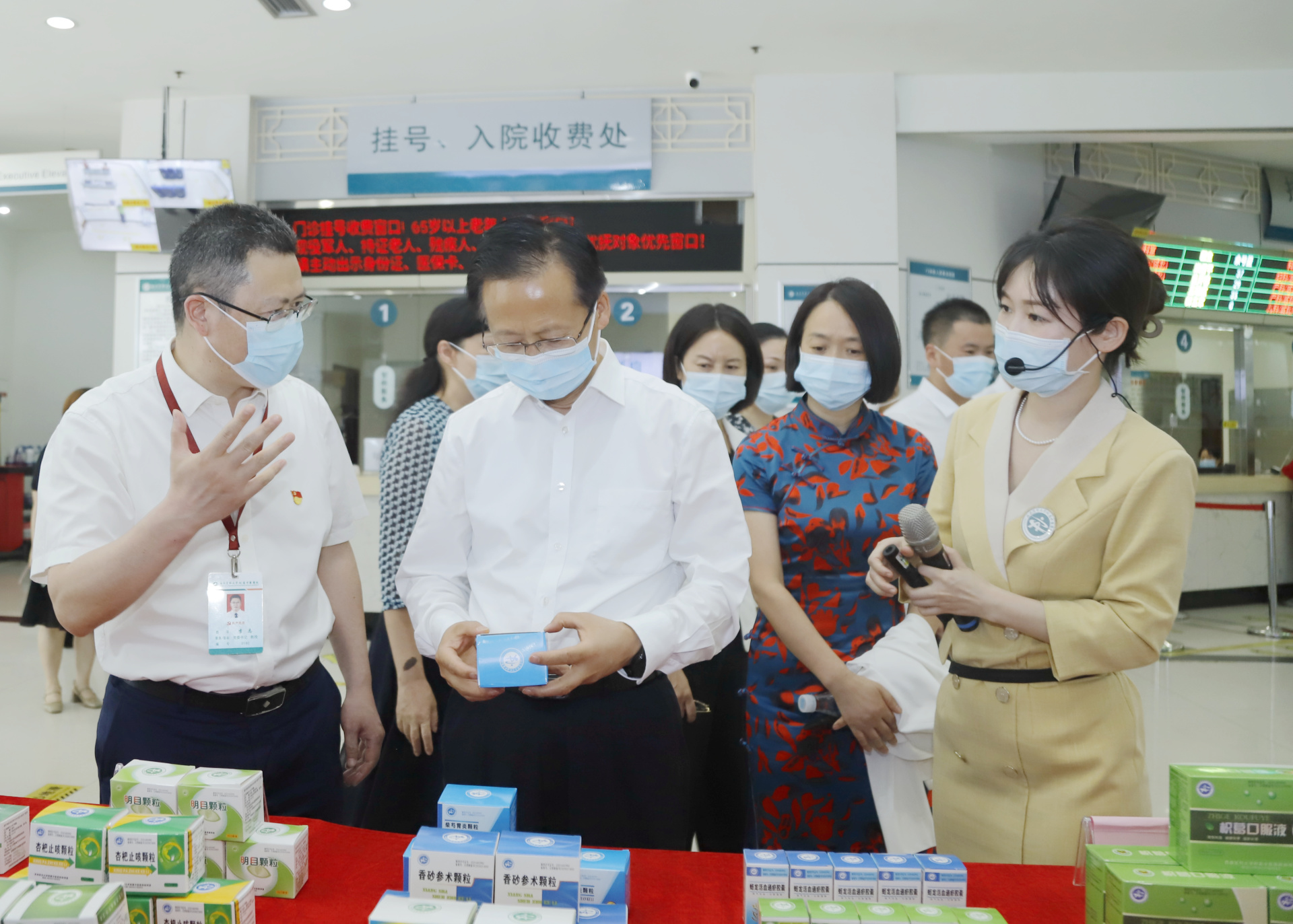 调研中,徐斌一行在我院党委书记李志等的陪同下,实地调研了我院院内制剂研制和中医药特色中心运行情况。李志就医院开展主题教育情况、国家中医药传承创新中心、国家中医药服务出口基地等重大项目推进情况及医院在党建文化、医疗、教学、科研、学科建设、国际合作与交流等方面的工作开展情况作了详细汇报。