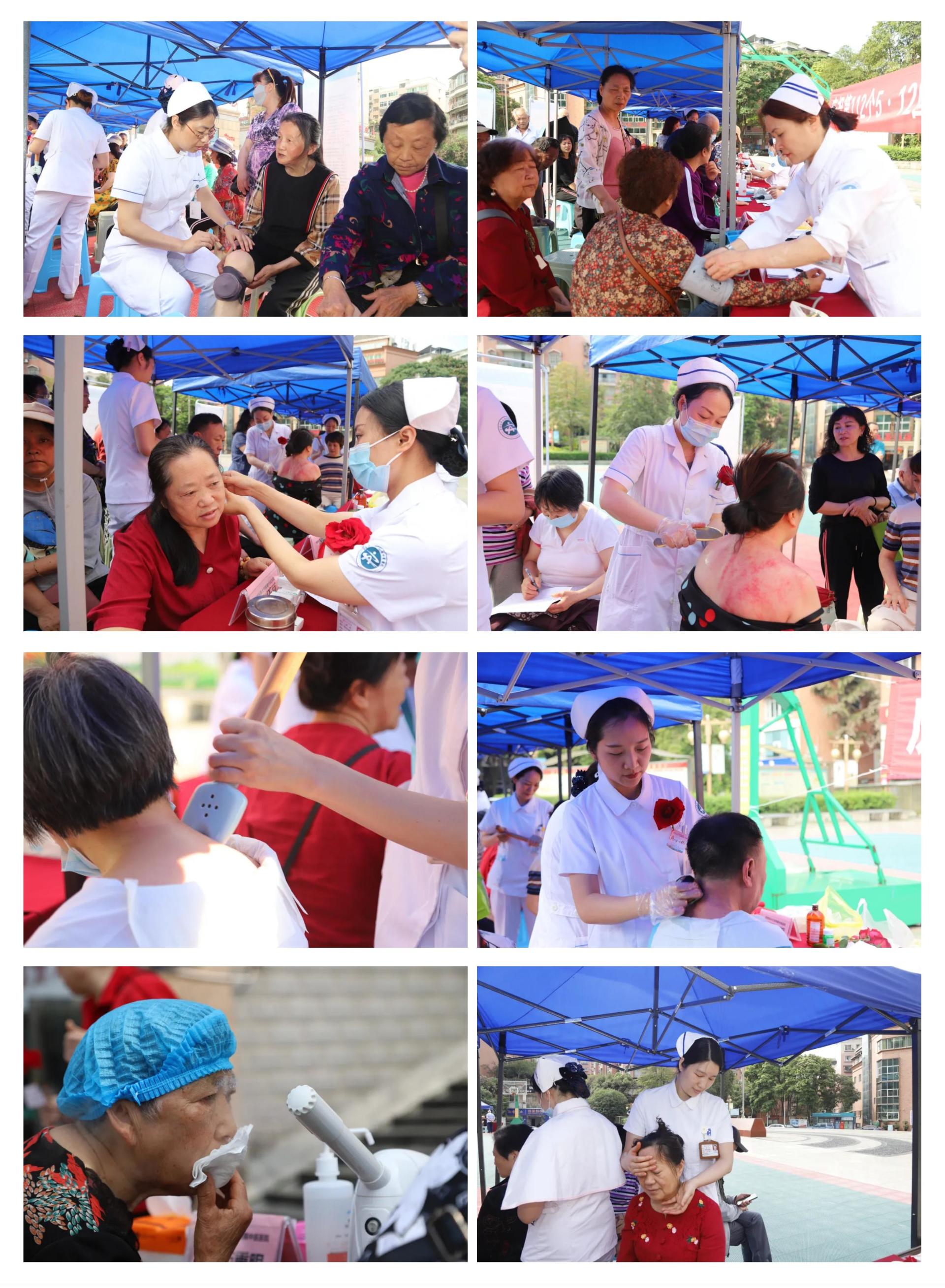 同时,我院在龙马潭区天立社区开设了分会场,护理部组织心血管内科、妇科、眼科、儿科、耳鼻咽喉科、骨伤科关节•足踝组、内分泌代谢病科、乳腺•甲状腺•血管外科、骨伤科创伤•正骨组、骨伤科脊柱•肿瘤二组、神经外科医护人员为社区居民提供了义诊服务和艾灸、中药熏眼、耳穴压豆、棍针、火龙罐、虎符铜贬刮痧等中医特色护理服务,推广了泸州市非物质文化遗产宋氏揪痧术、履蛋热熨术,并设置了以“‘花’一生·呵‘护’你”为主题的花墙,通过活动让部分居民将鲜花赠送给从事医疗工作的家属、现场义诊的医护人员、离退休的护士、助产士等。