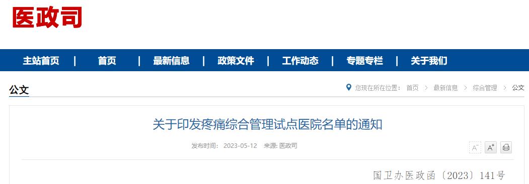 近日,国家卫生健康委员会、国家中医药管理局联合公布了疼痛综合管理试点医院名单,由我院疼痛科、麻醉科申报的疼痛综合管理项目成功入选。