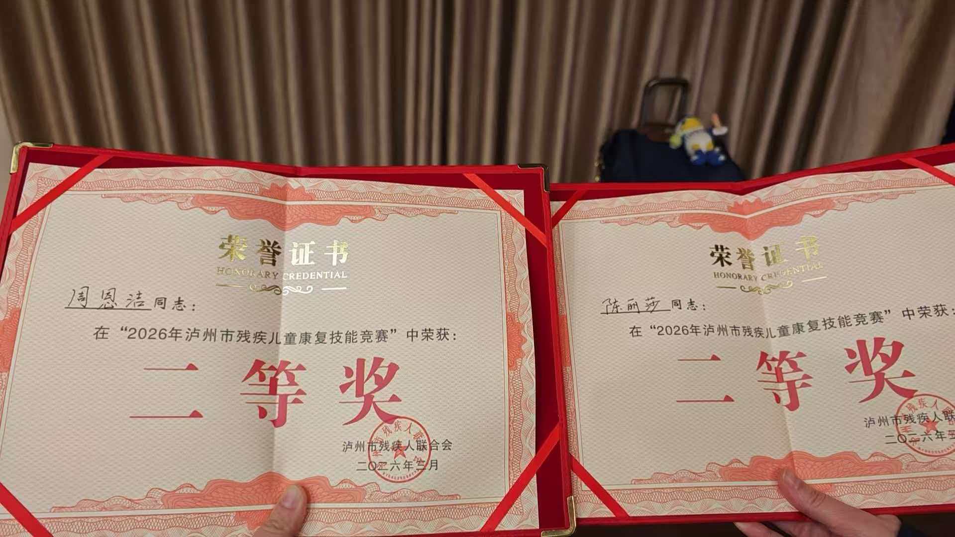 3月27日,由泸州市残疾人康复服务中心主办的2026年泸州市残疾儿童康复技能竞赛举行。我院针灸·推拿·康复科儿童康复组周恩洁治疗师和陈莉莎副主任医师凭借扎实的理论功底、精湛的实操技能与专业的康复素养,在激烈角逐中脱颖而出,荣获肢体组二等奖。