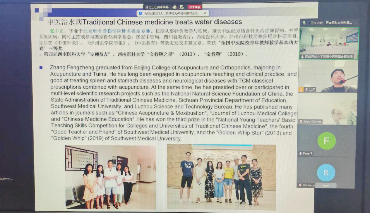 3月30日,我院国际合作与对外交流部利用线上网络平台,邀请针灸推拿教研室张丰正老师为葡萄牙、西班牙的20余名中医爱好者作了题为《中医治水病》国际远程培训。