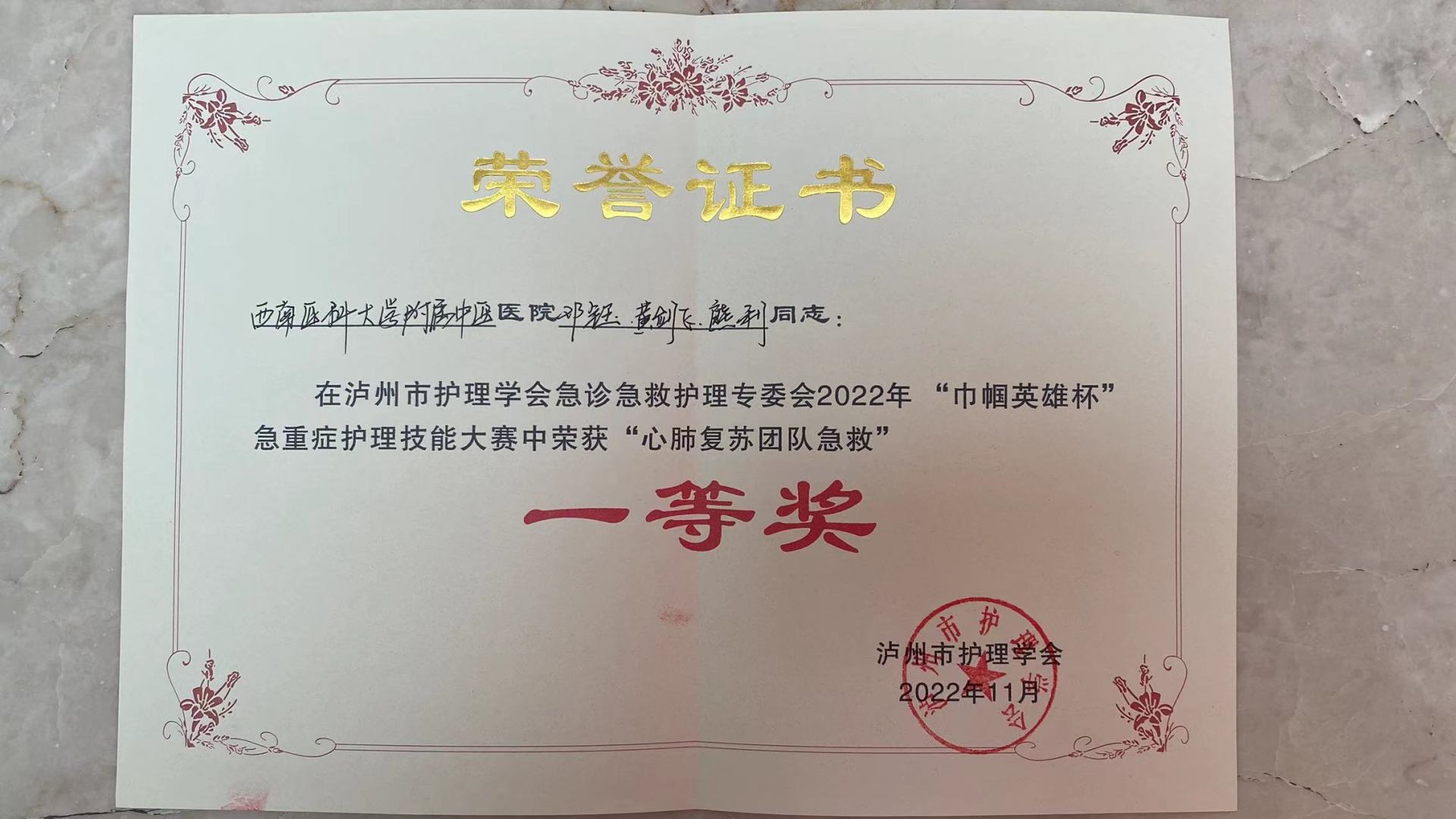 近日,泸州市护理学会急诊急救护理专委会2022年“巾帼英雄杯”急重症护理技能大赛举行,我院急诊科邓钰、黄剑飞,重症医学科熊利荣获“心肺复苏团队急救”一等奖。