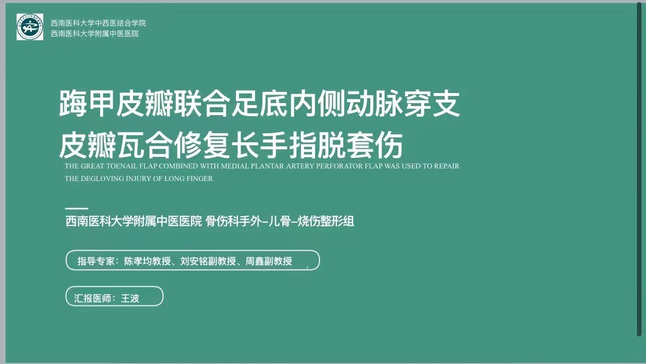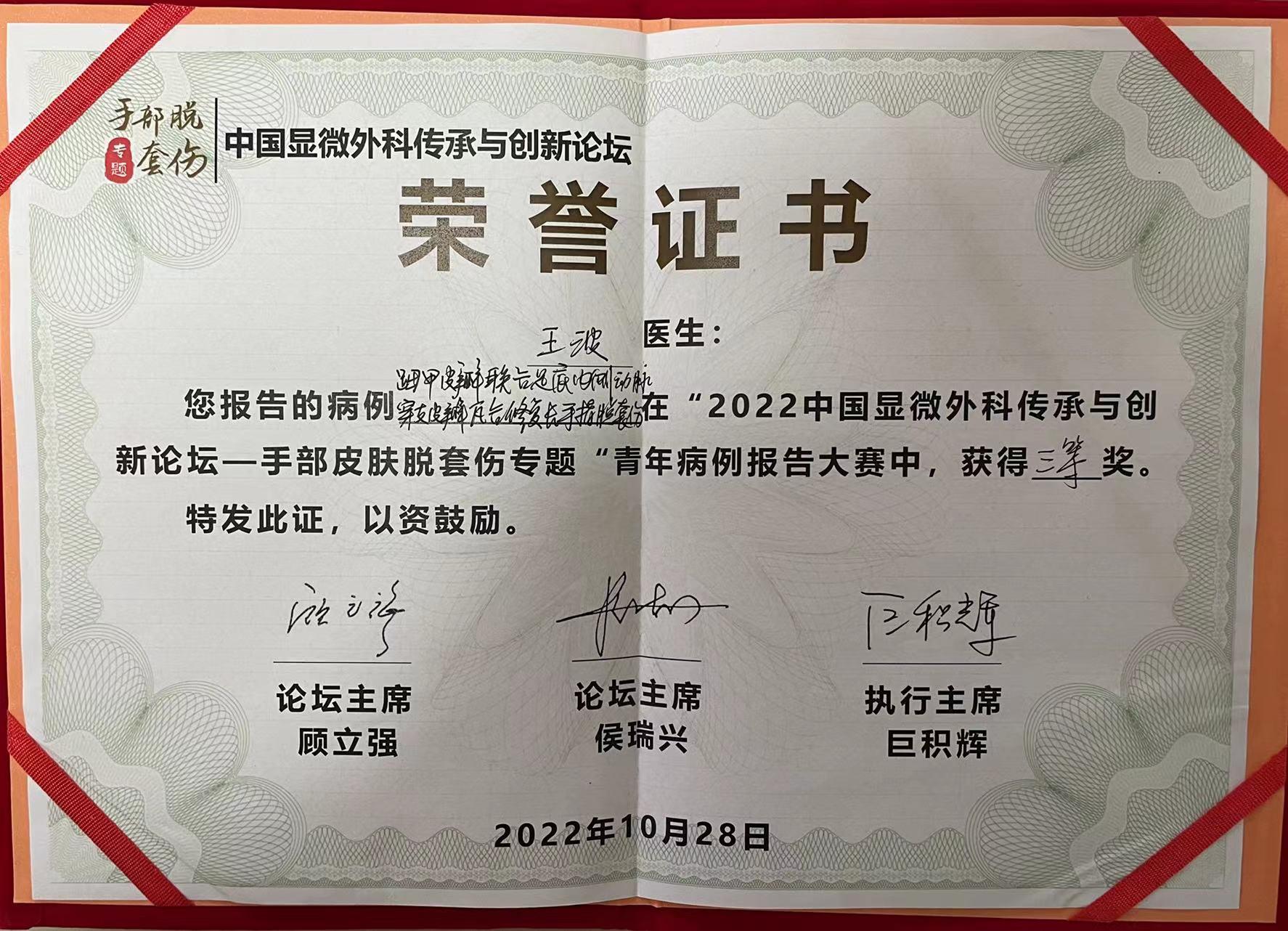 近日,“2022中国显微外科传承与创新论坛—手部皮肤脱套伤专题”青年病例报告大赛在江苏举行,我院手外·儿骨·烧伤整形组医生王波报告的病例《踇甲皮瓣联合足底内侧动脉穿支皮瓣瓦合修复长手指脱套伤》荣获三等奖。
