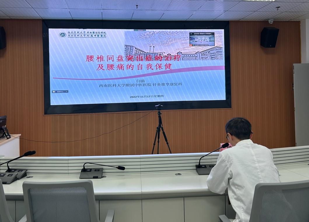 讲座中,闫爵以“腰椎间盘突出症的治疗和腰痛的自我保健”为题,讲解了腰椎间盘突出症的症状、保健知识,分享了养生心得和理念,并远程为三位患者提供了健康指导。