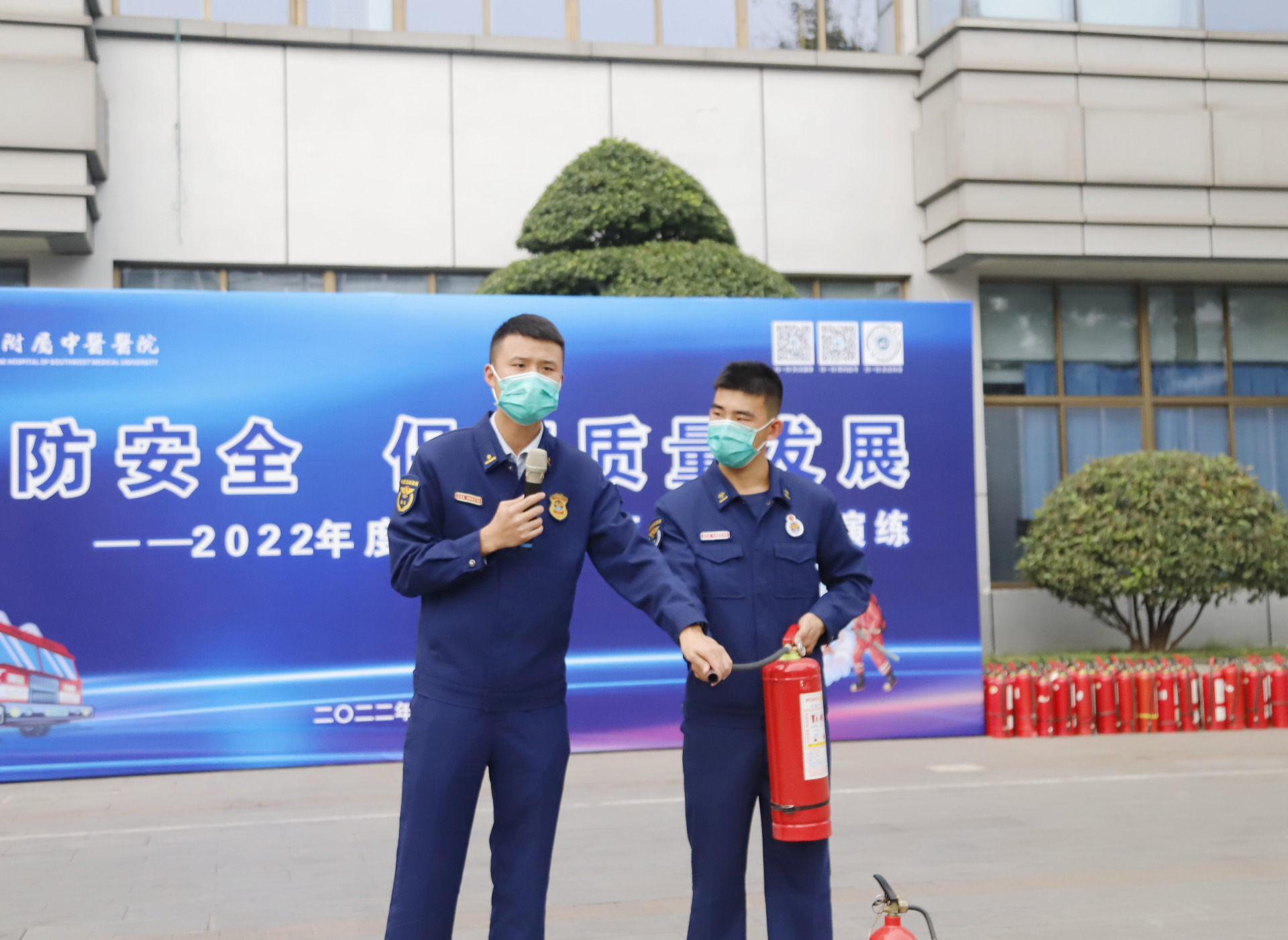 在门诊广场,龙马潭区摇翔路中队消防站副站长刘子豪向参训人员详细讲解了灭火器及防烟面罩使用等消防安全知识。