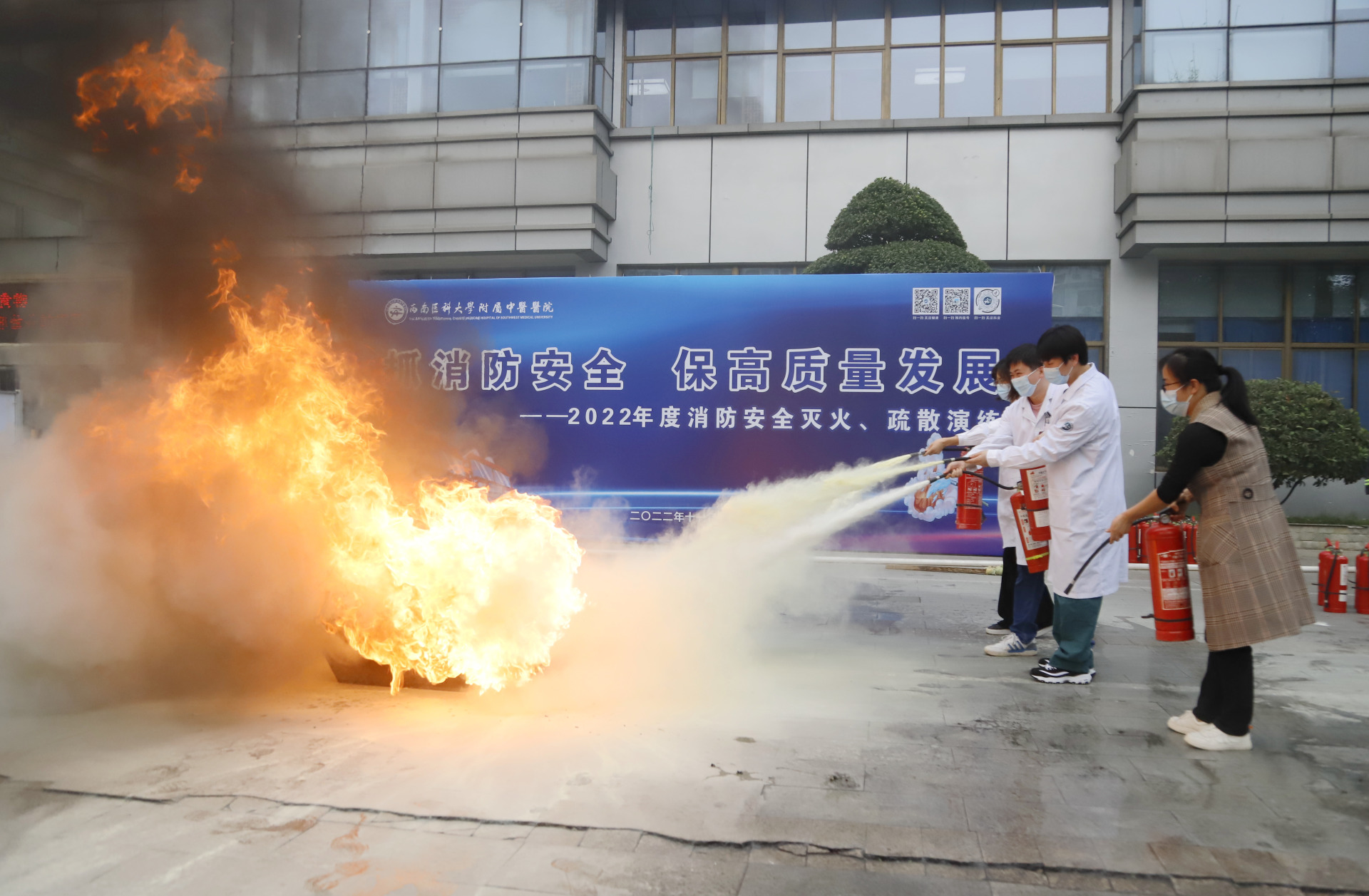 随后,在门诊4楼模拟了火灾场景,开展了消防疏散逃生演练。刘子豪对逃生演练中存在的问题进行了现场点评和指导;全体人员在门诊广场分批次练习了用灭火器扑灭初期火灾的方法。