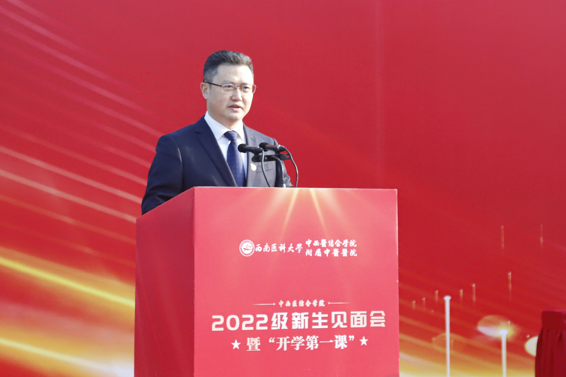 刘建致辞,他对517名新同学的到来表示热烈欢迎,并介绍了中西医结合学院的基本情况。他希望2022级全体同学要厚植情怀,勇担时代责任;力学笃行,用青春去热爱;守正创新,向未来去致敬,用美好的青春年华追逐初心与梦想,为繁荣祖国的中医药事业贡献自己的智慧和力量,不负时代、不负韶华!