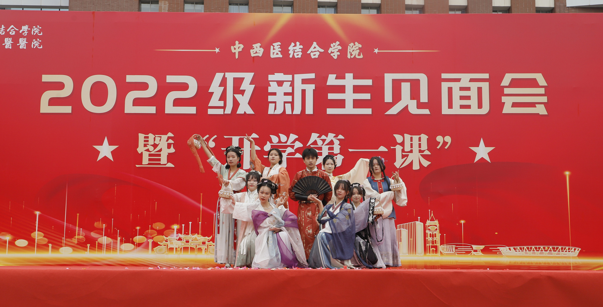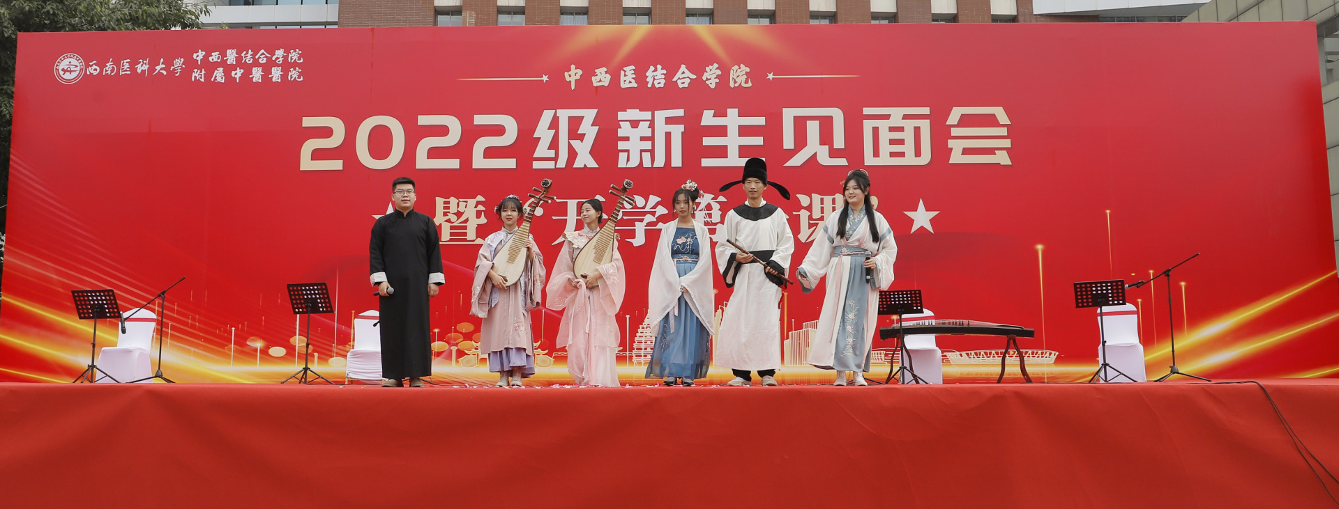 最后,迎新文艺活动举行,2022级全体新同学表演了导引术、《十二花神》汉服秀、师生民乐等。