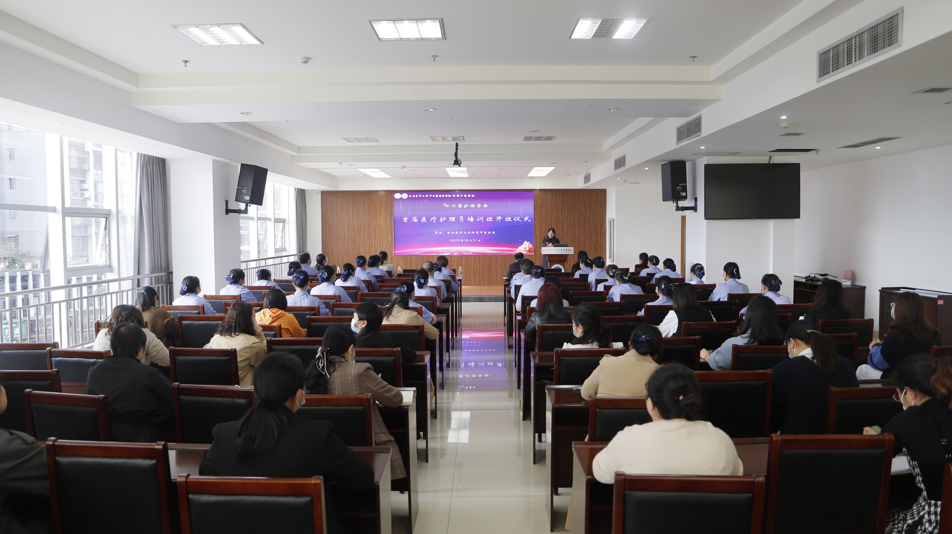 2022年10月31日,我院举行首届医疗护理员培训班开班仪式,医院副院长汪国友、护理部相关人员、基地科室护士以及30名学员参加了开班仪式。仪式由护理部部长李素莲主持。