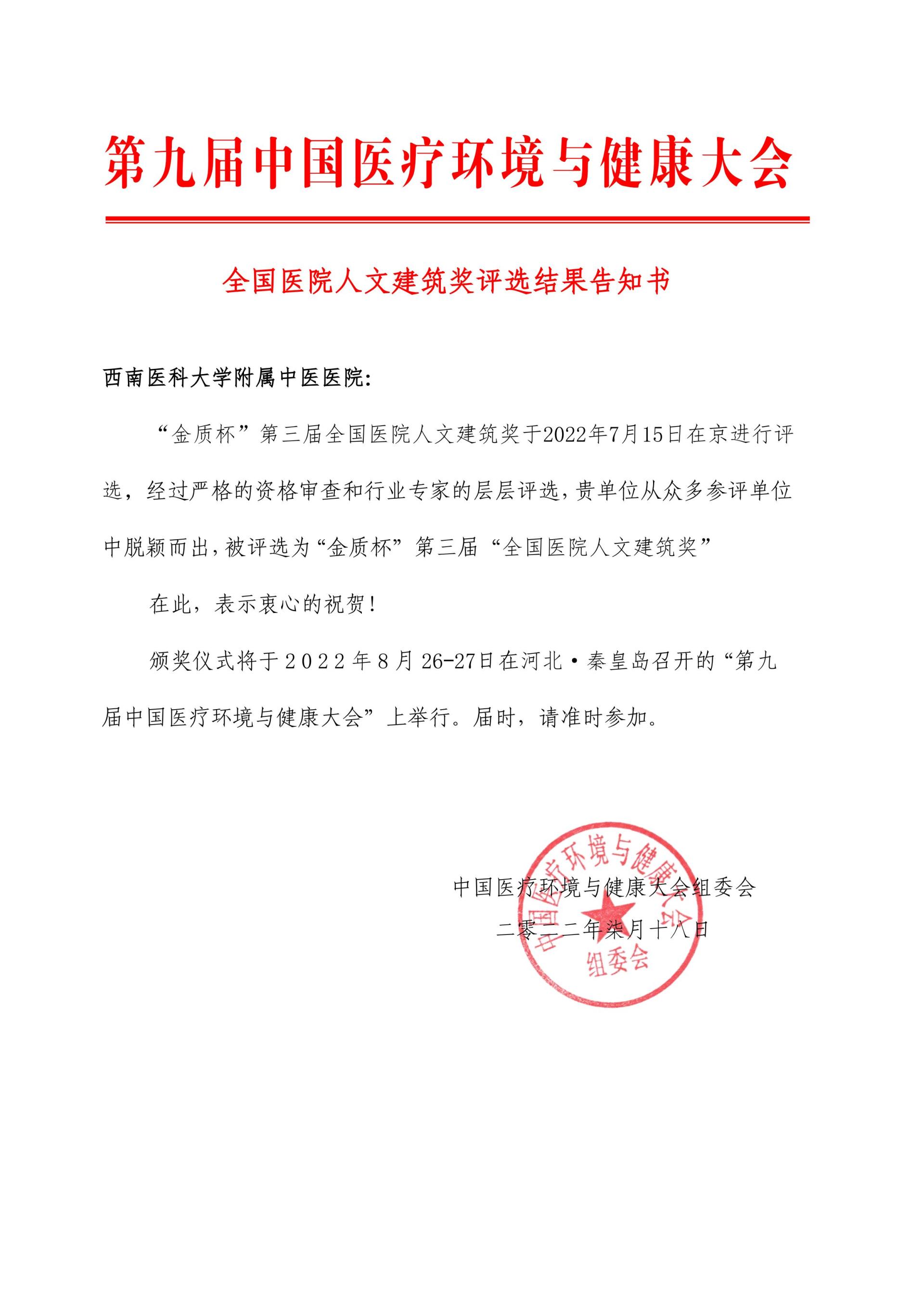 我院衣钵苑及天桥景观工程项目在第九届中国医疗环境与健康大会中荣获“金质杯”第三届“全国医院人文建筑奖”。