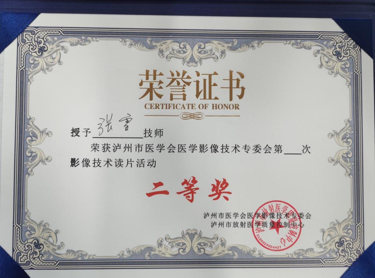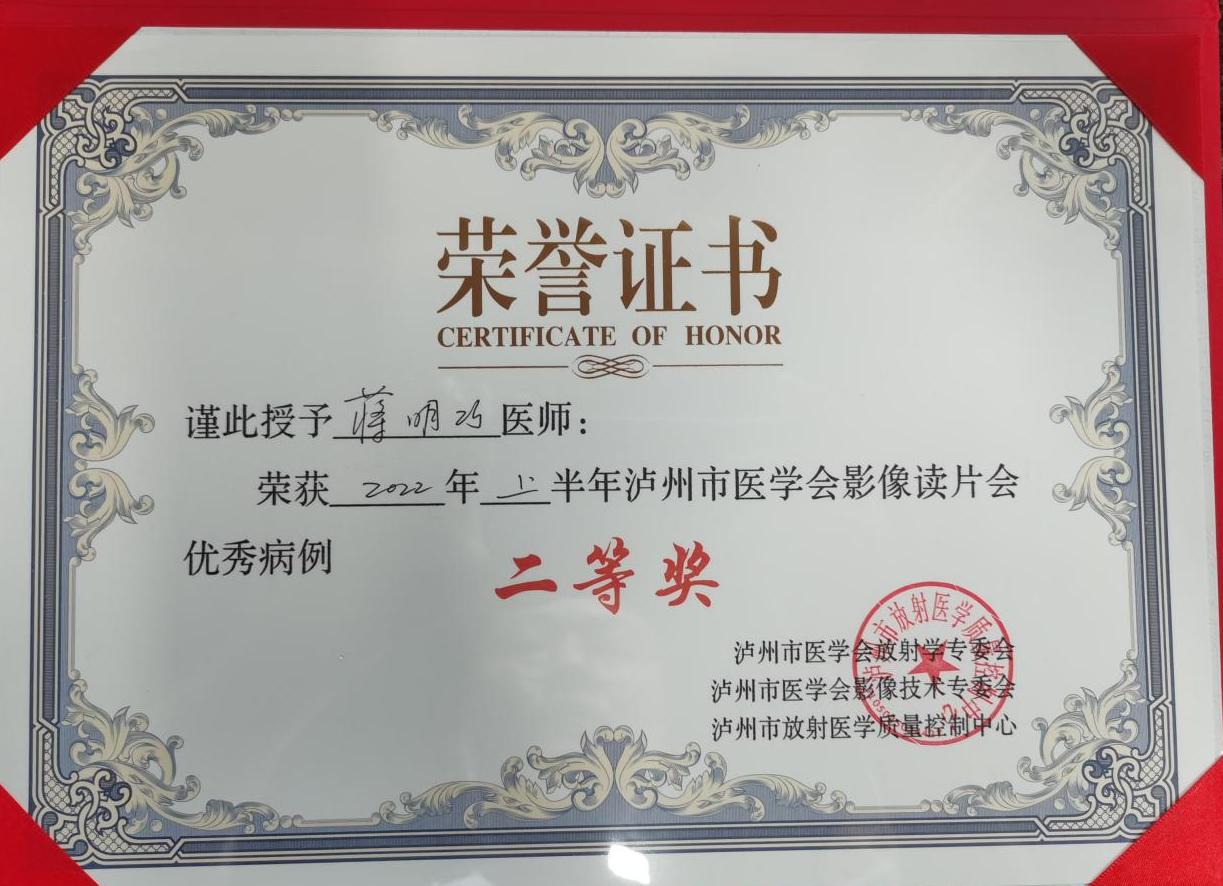 7月16日,泸州市医学会举行了2022年上半年医学影像读片会,我院放影像射科CT、普放组张雪技师荣获“泸州市医学会影像技术专委会第3次影像技术读片会二等奖”、蒋明巧医师荣获“2022年上半年泸州市医学会影像读片会优秀病例二等奖”。