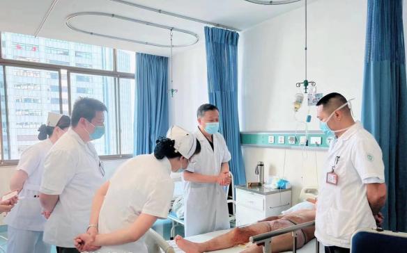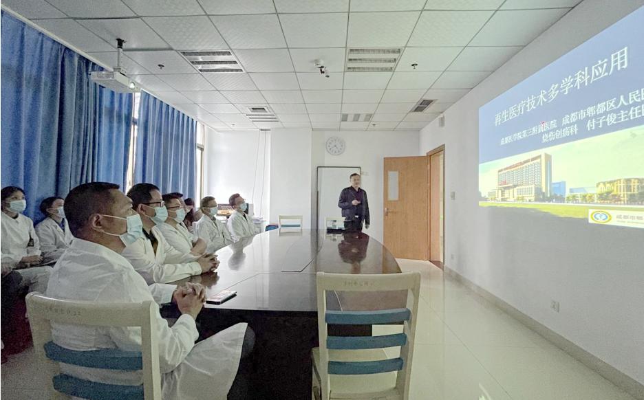 2022年7月15日,中国中西医结合烧伤专业委员会副主任委员、成都市郫都区人民医院烧伤外科主任付子俊教授受邀到我院骨伤科手外·儿骨·烧伤整形组开展了查房和会诊,现场示范了如何清除创面污垢、换药等,并作了《再生医疗技术多学科应用》专题讲座。