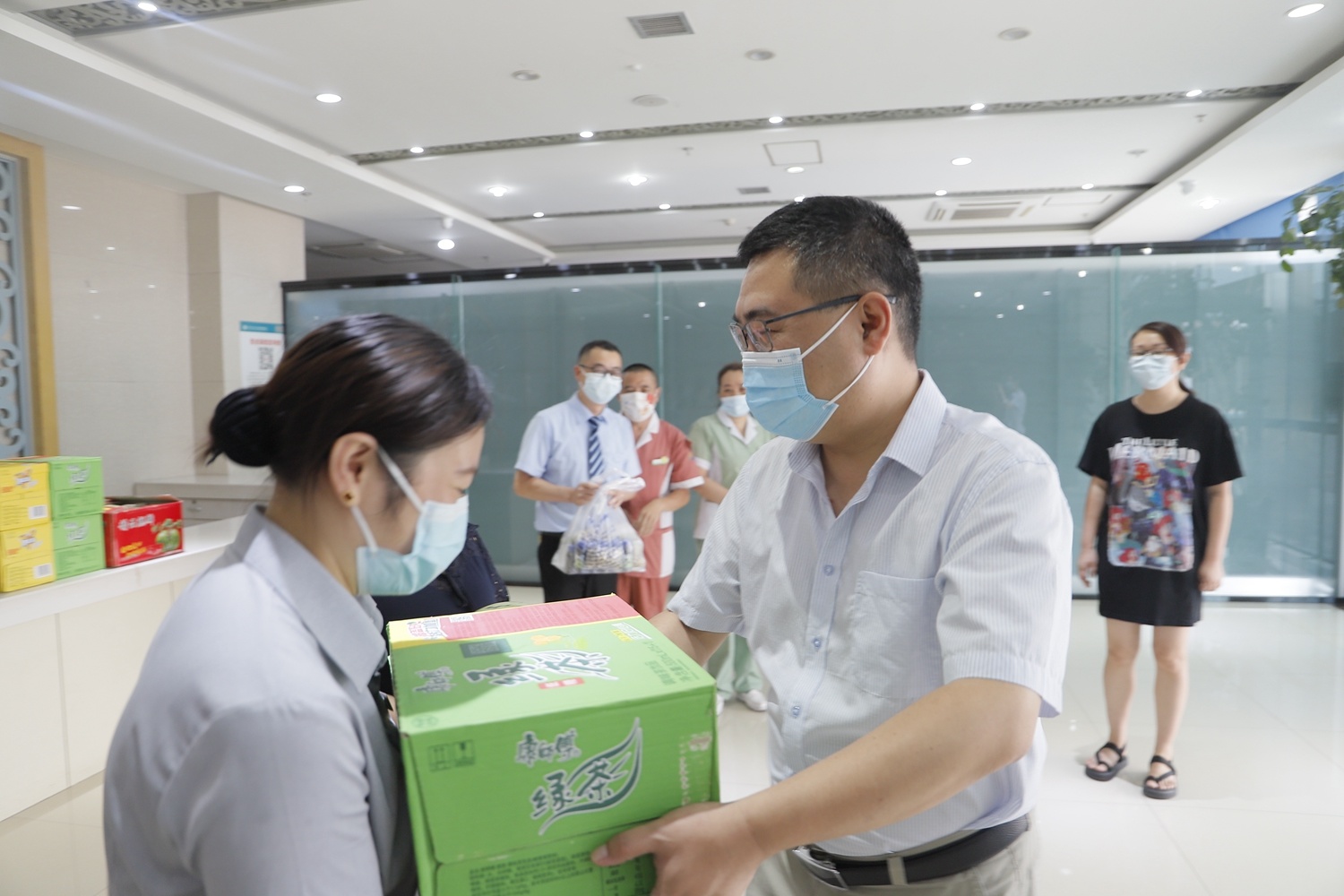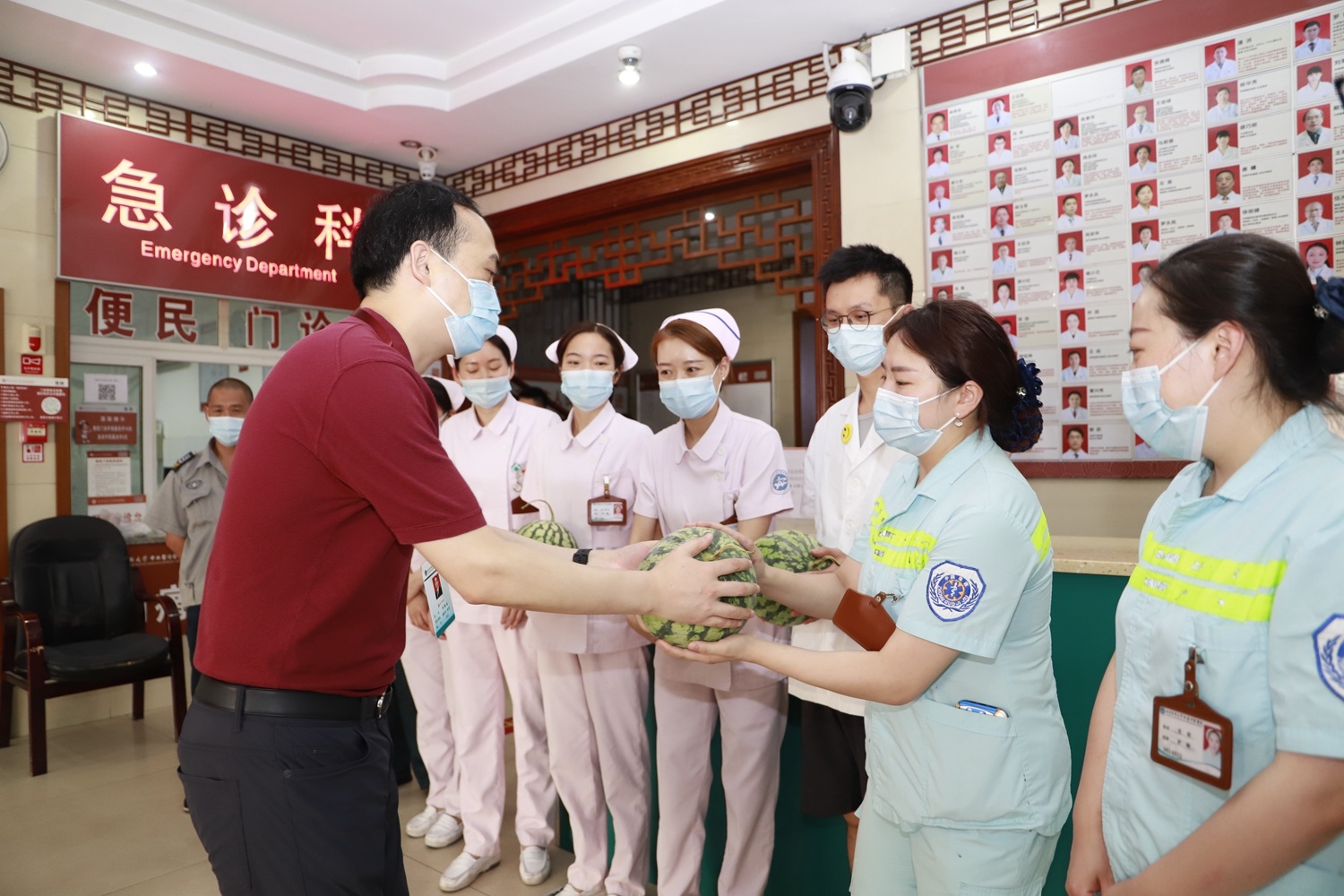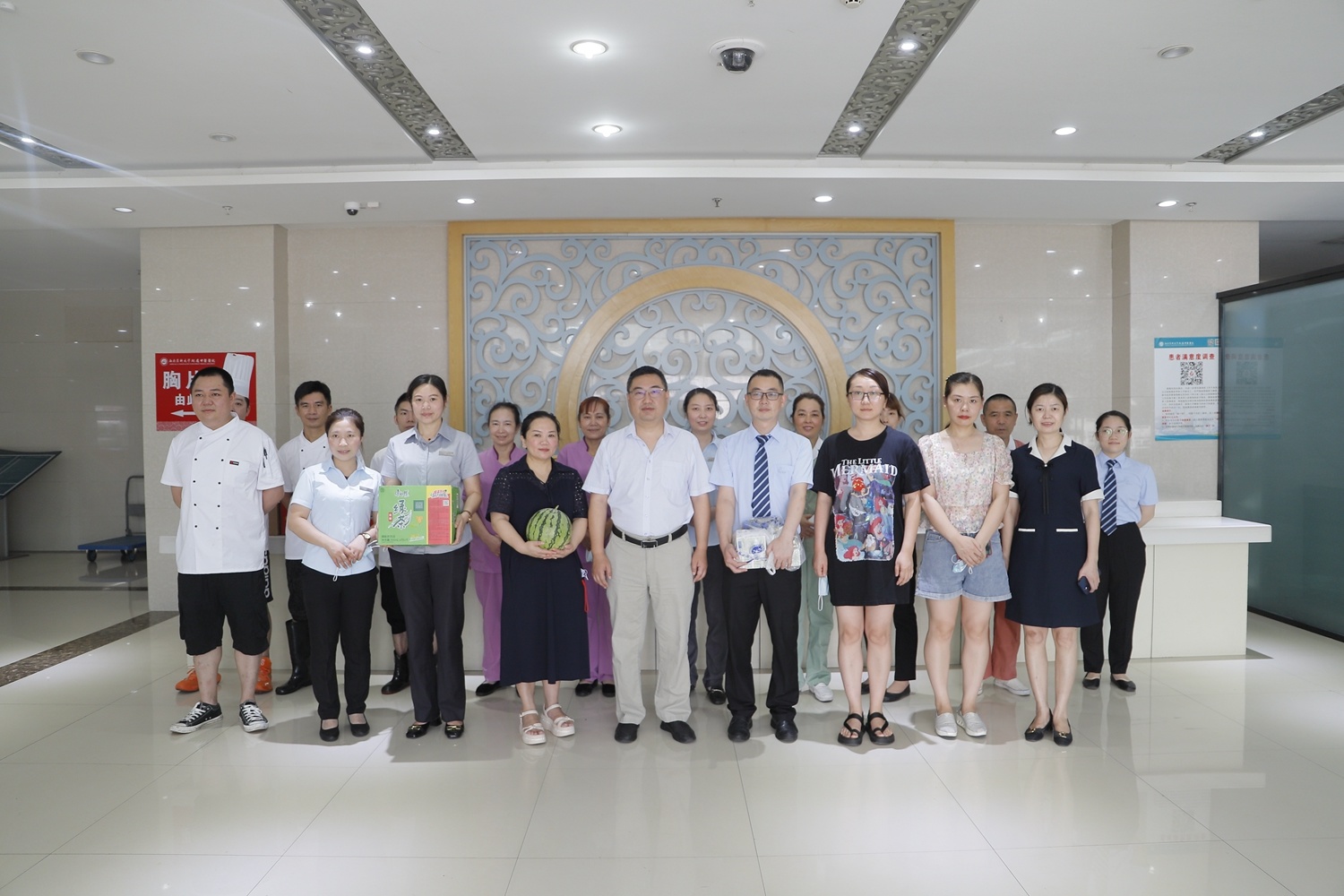 2022年7月11-12日,我院党委书记李志、院长刘建等院领导带领相关职能部门人员分别看望了城北院区、忠山院区和水井沟院区在高温下坚守岗位的一线员工代表,为他们送去了防暑降温物品。