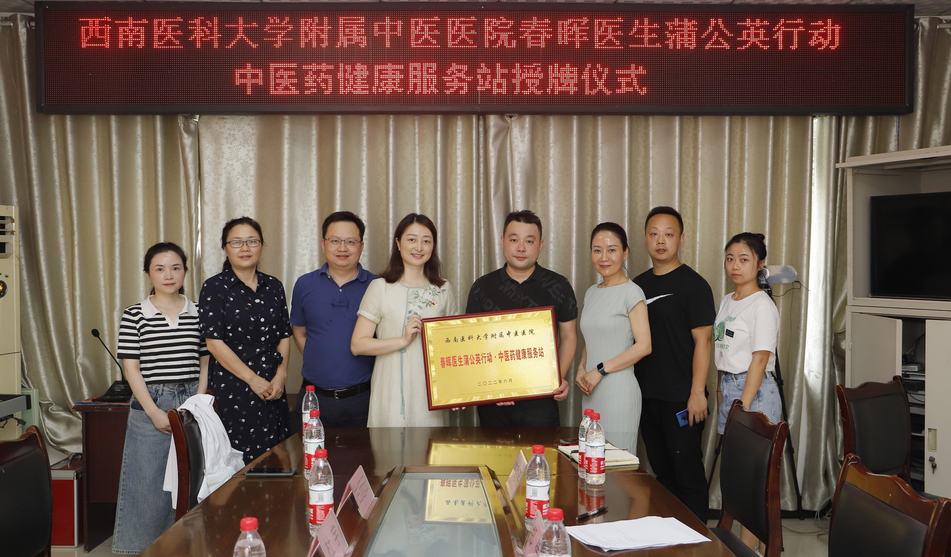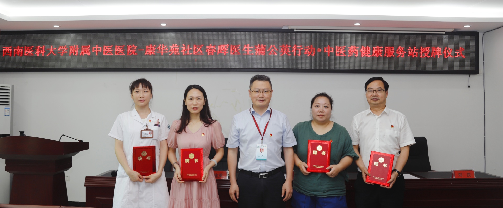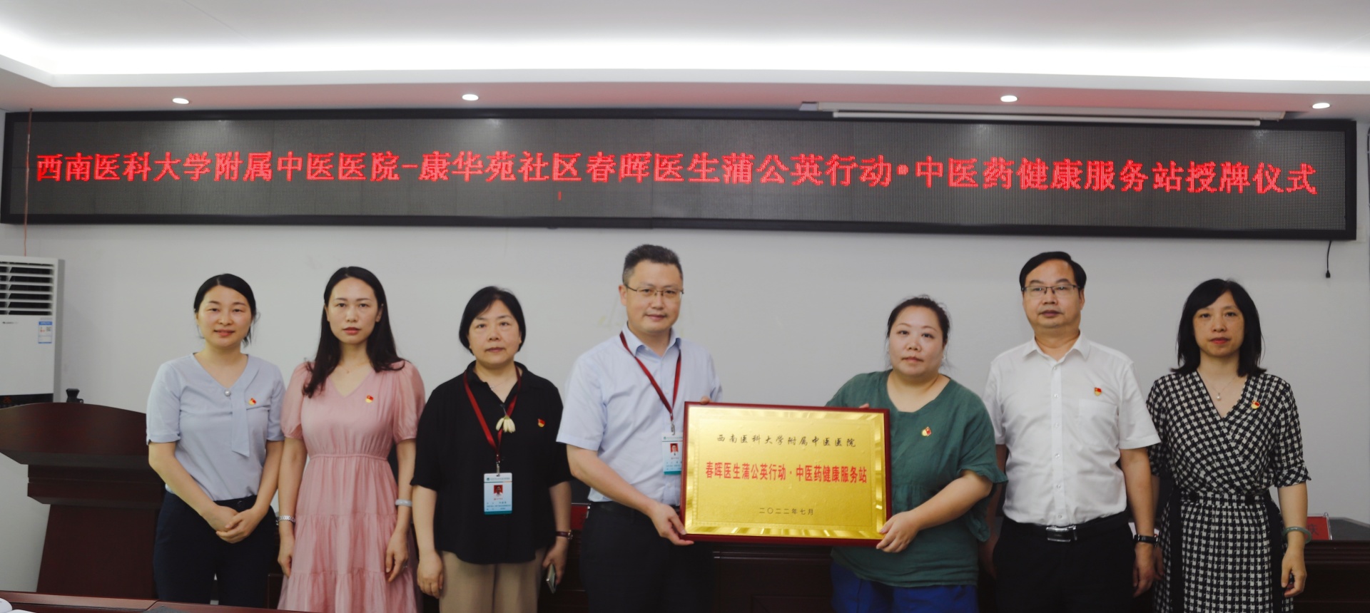 2022年7月1日,我院疼痛科党支部、宣传统战党支部与泸州市江阳区康华苑社区党委举行了春晖医生蒲公英行动·中医药健康服务站授牌仪式,医院党委书记李志,康华苑社区党委副书记、纪委书记谢琴,党委副书记罗蔺及我院相关党支部医务人员、社区相关人员等参加了仪式。