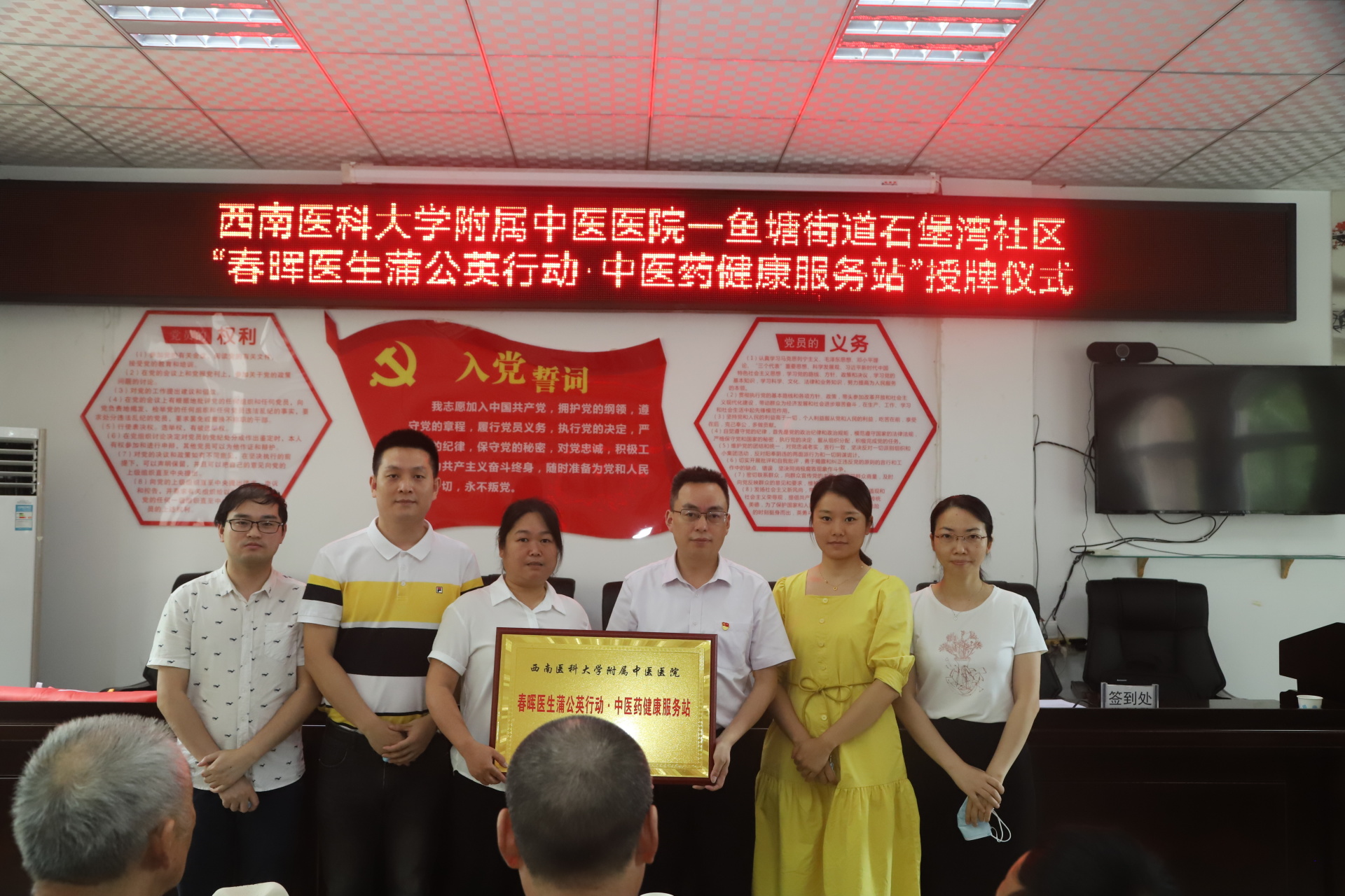 7月1日,我院放射影像科(介入)党支部、神经内科党支部与泸州市龙马潭区鱼塘街道石堡湾社区党委举行了春晖医生蒲公英行动·中医药健康服务站授牌仪式,医院党委副书记雷学举、石堡湾社区党委书记张小容及相关支部人员、社区群众参加了仪式。