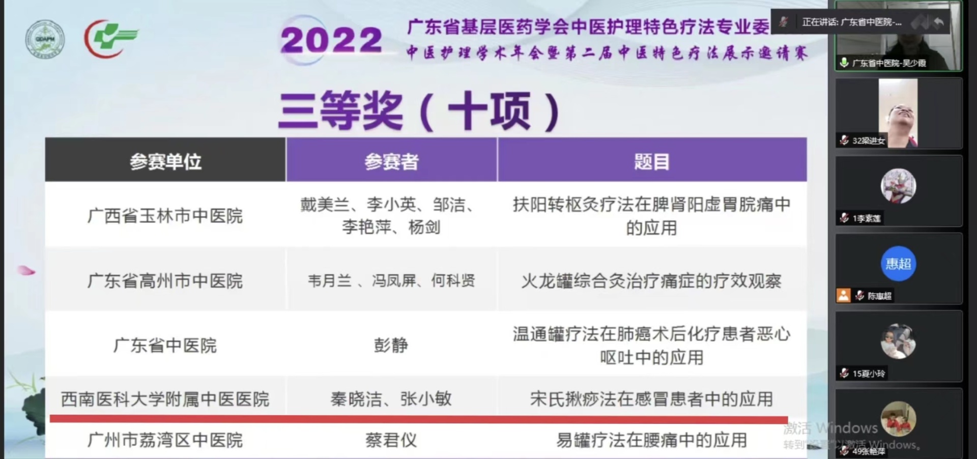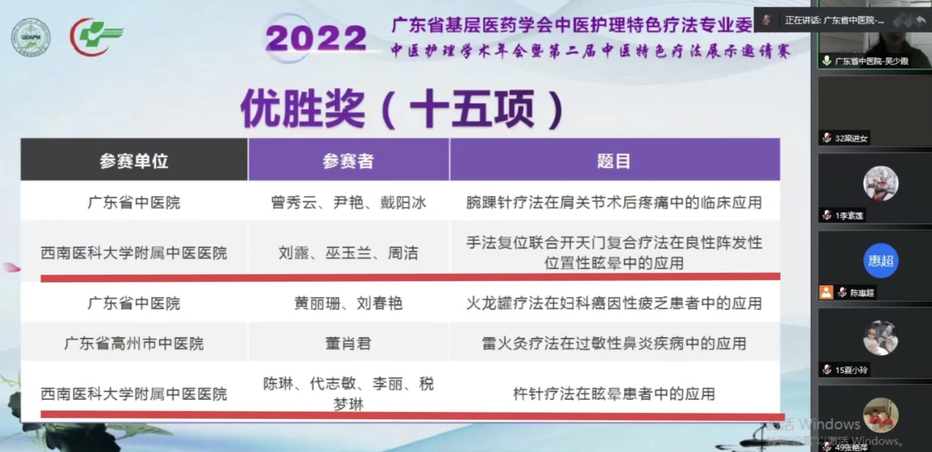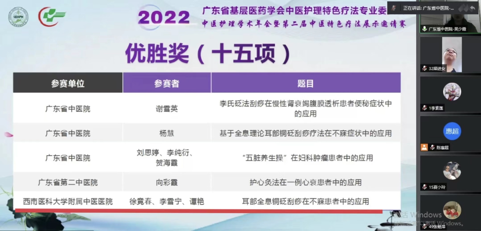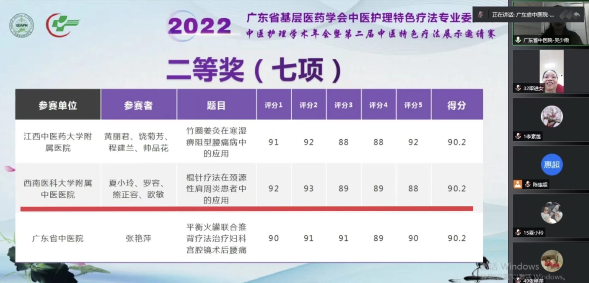 2022年6月17日,广东省基层医药学会中医护理特色疗法专委会第二届中医特色疗法展示邀请赛决赛在线上召开,由我院选送的5项中医特色疗法在全国各地中医医院选送的罐法、灸法、砭法、针法等11项中医特色疗法决赛中分别获得了二等奖1项、三等奖1项、优胜奖3项。