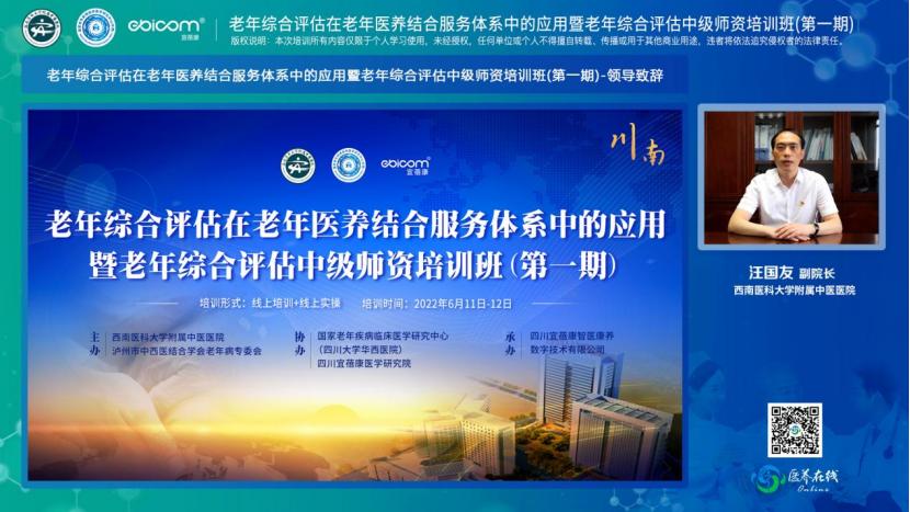 2022年6月11-12日,“老年综合评估在老年医养结合服务体系中的应用暨老年综合评估中级师资培训班(第一期)”在线上举行。国家老年疾病临床医学研究中心(华西)主任董碧容、我院副院长汪国友及从事老年医学、老年照护相关行业人员等参加了会议。