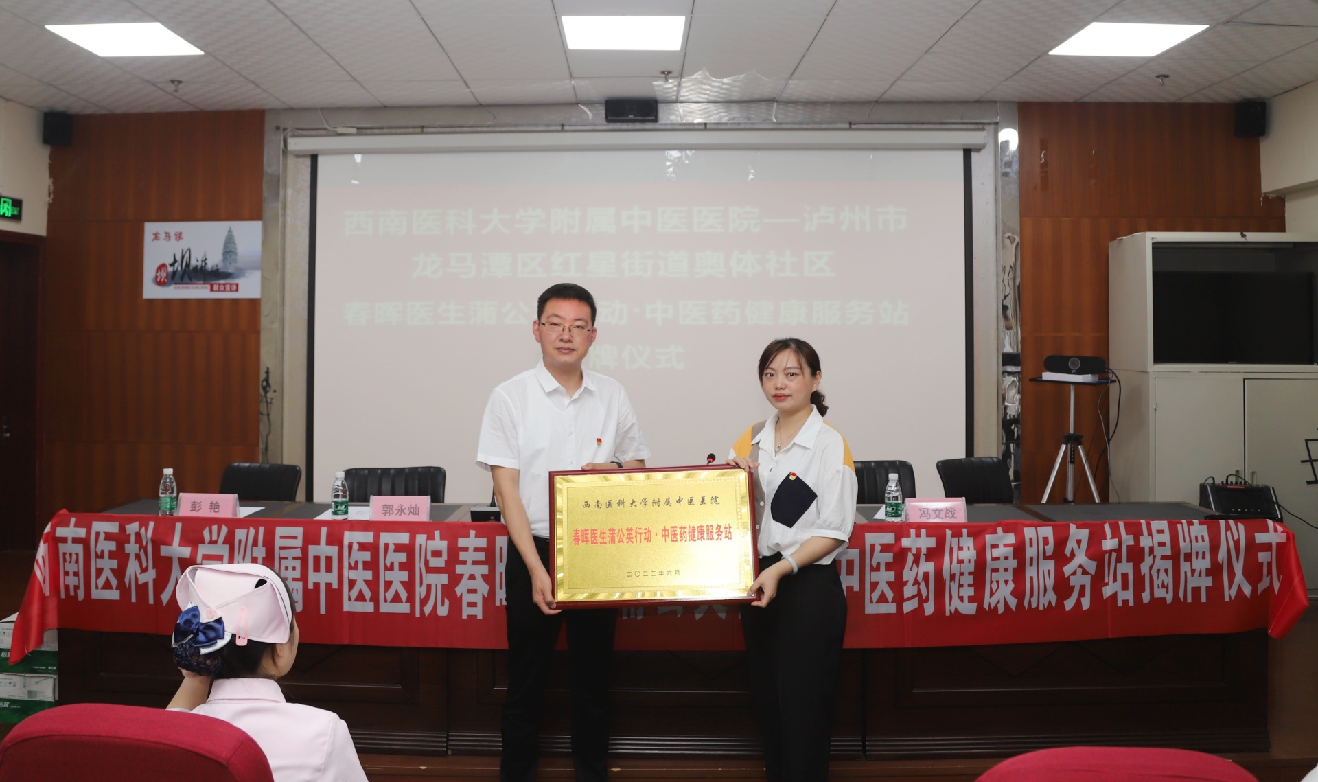 6月10日,我院全科医学科·VIP病房党支部、检验科党支部与泸州市龙马潭区红星街道奥体社区举行了春晖医生蒲公英行动·中医药健康服务站授牌仪式。医院副院长徐厚平,奥体社区党总书记陈楠及我院相关党支部医务人员等参加了仪式。仪式由陈楠主持。