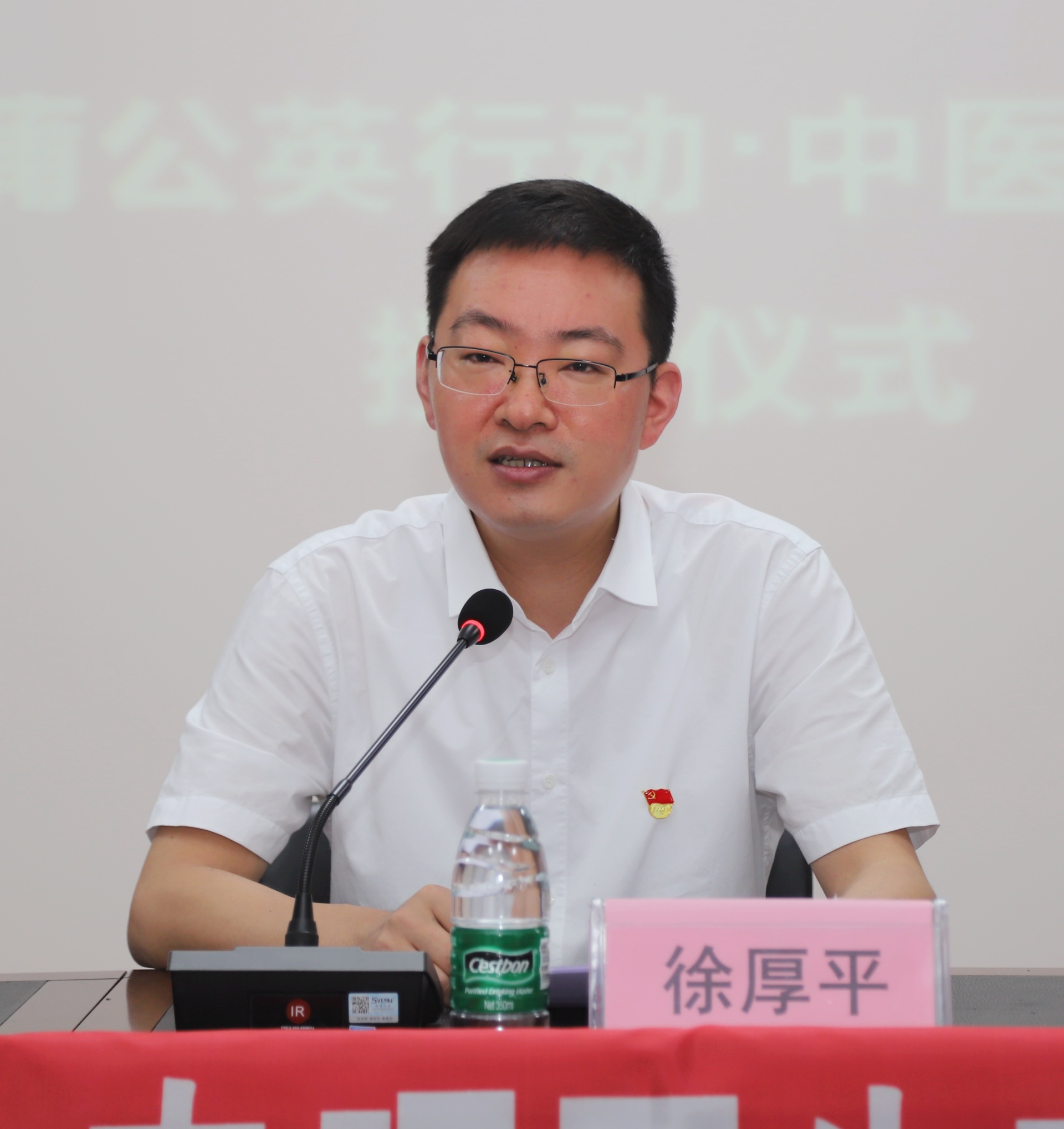 徐厚平讲话,他介绍了我院基本情况,表示将以此次共建活动为契机,充分发挥中医药特色优势,进一步促进优质医疗资源下沉,切实为人民群众做好事、办实事,更好地为社区群众的健康服务。