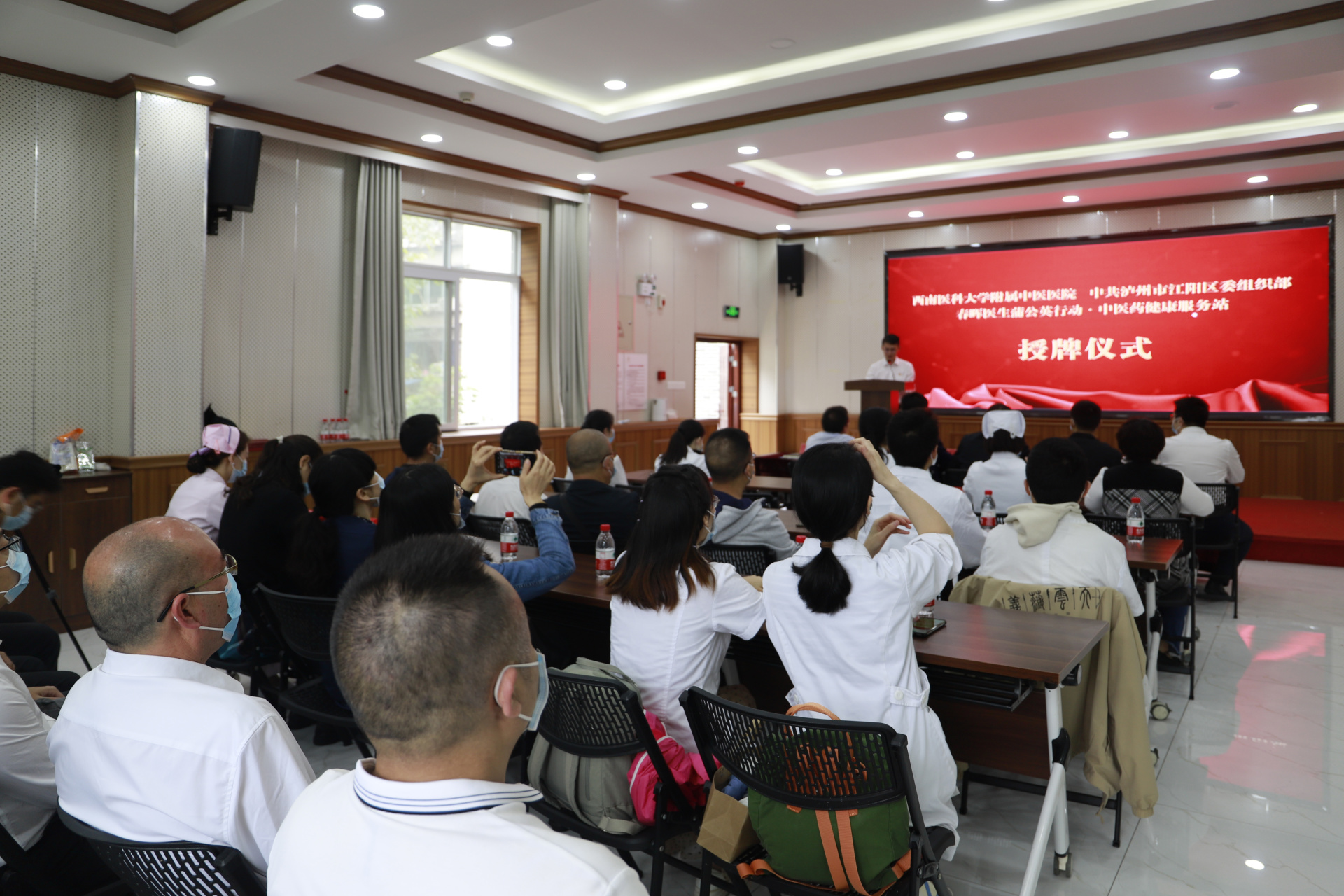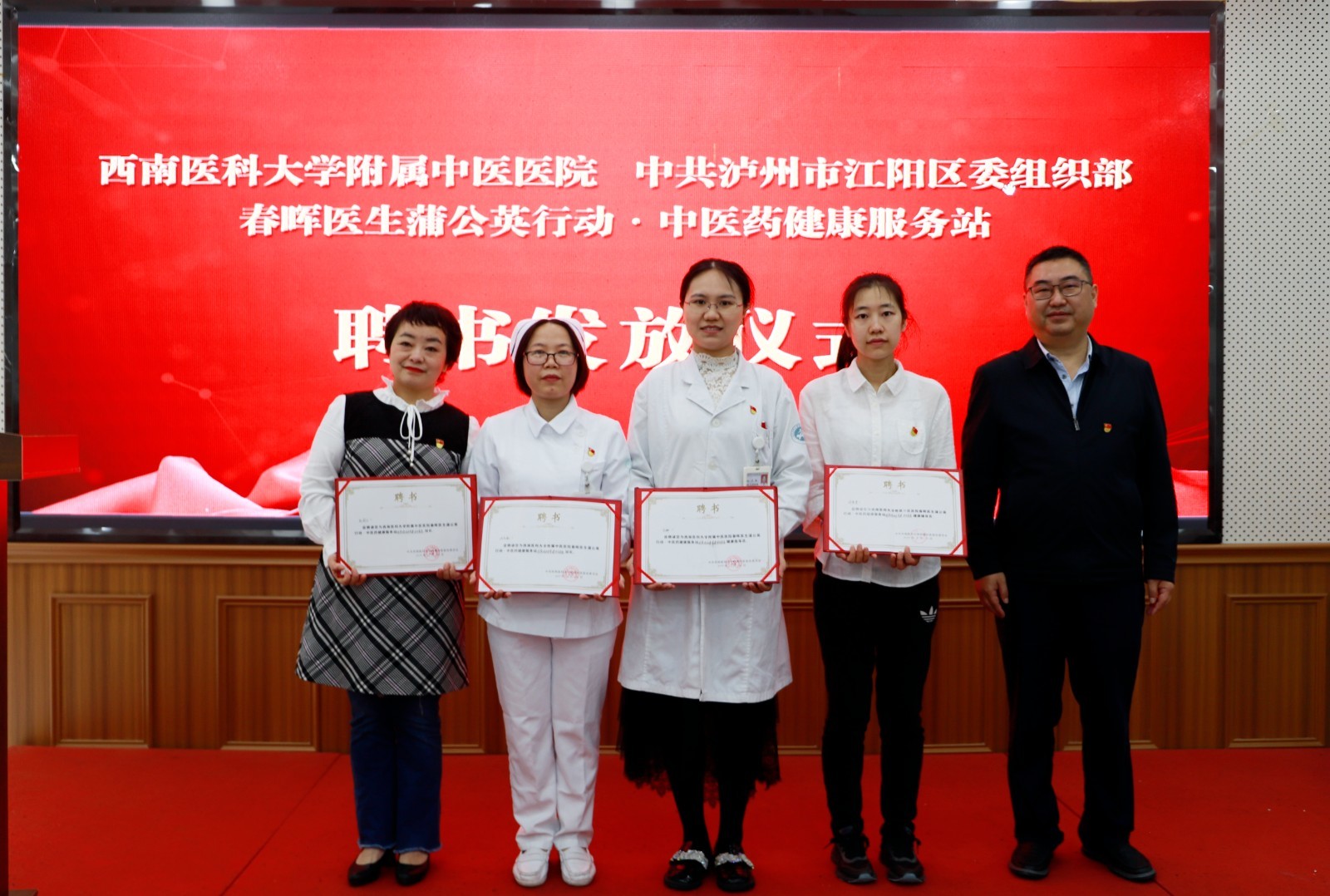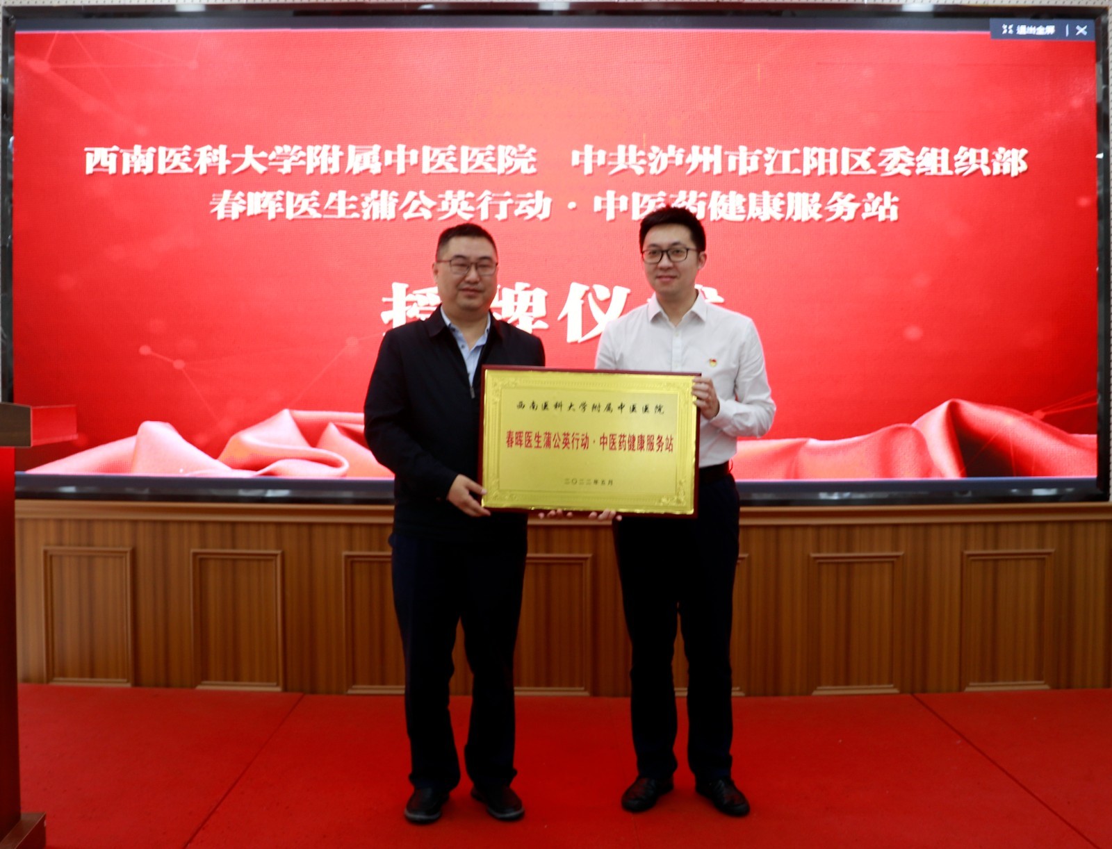 2022年5月20日,我院与泸州市江阳区委组织部举行了春晖医生蒲公英行动·中医药健康服务站授牌仪式,综合内科、基础教工党支部与江阳区报恩塔商圈城市党建综合党委结对共建,泸州市江阳区委组织部副部长罗太明、冯涛,医院副院长张建堂及相关人员等参加了仪式。仪式由冯涛主持。