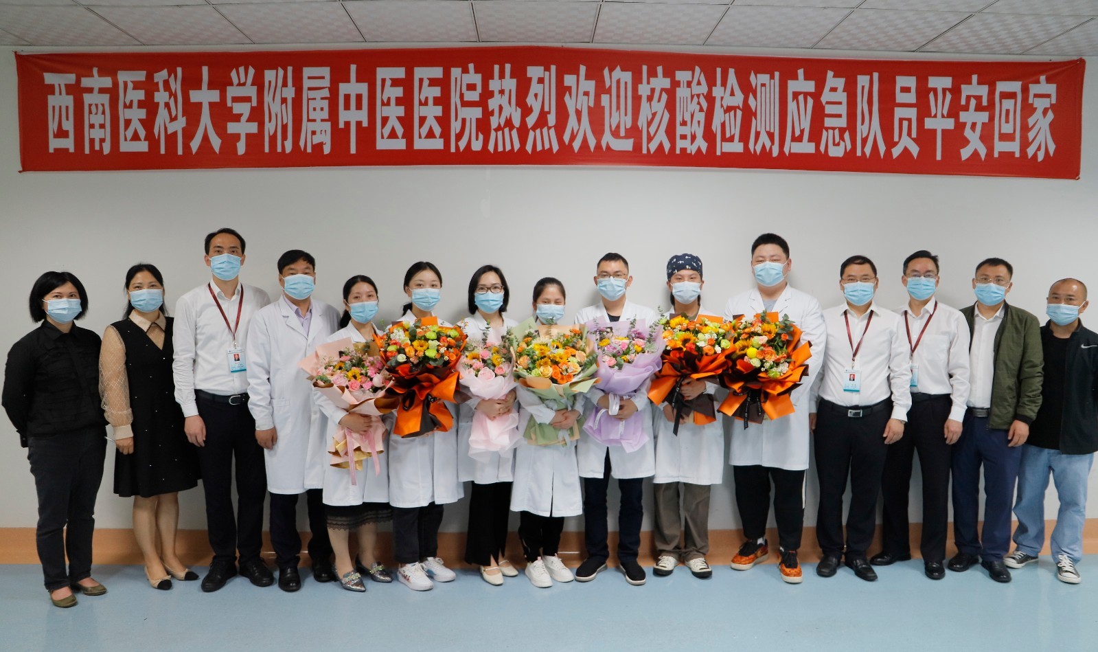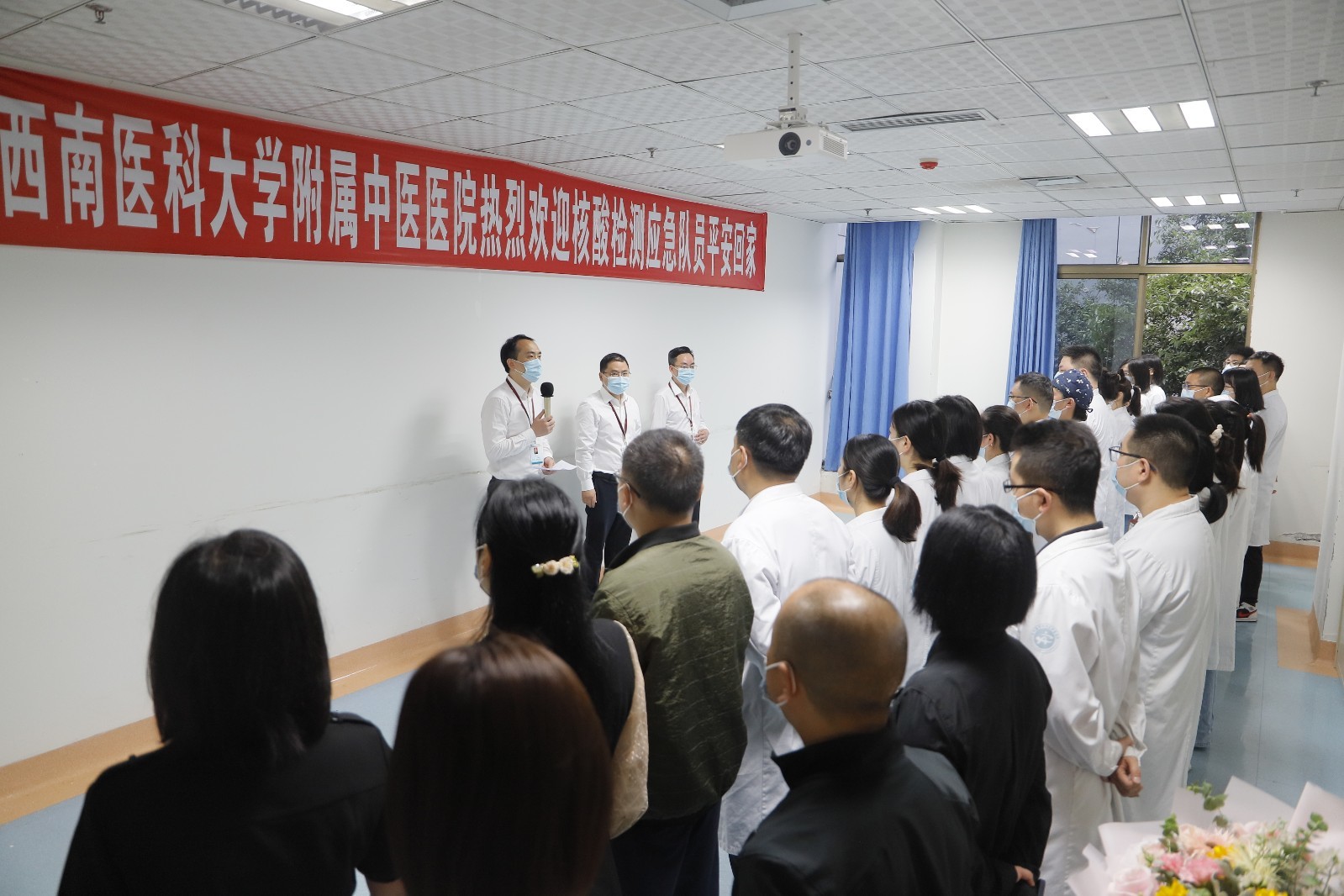 刘建讲话,他对3位援吉核酸检测应急队队员顺利完成任务、回到工作岗位表示热烈欢迎,对8位支援外省的核酸检测应急队队员为抗疫工作所作出的贡献表示衷心感谢。他指出,在当前新冠疫情反复多变的形势下,检验科除了要完成日常检验工作,还应时刻做好闻令而动、向疫而行的准备,只要国家有召唤,就能随时出征,无论是在日常工作中还是在核酸检测的战场上,都应谨记仁和精诚、佑护生命的使命,充分展示西南医大中医人的精神风采。