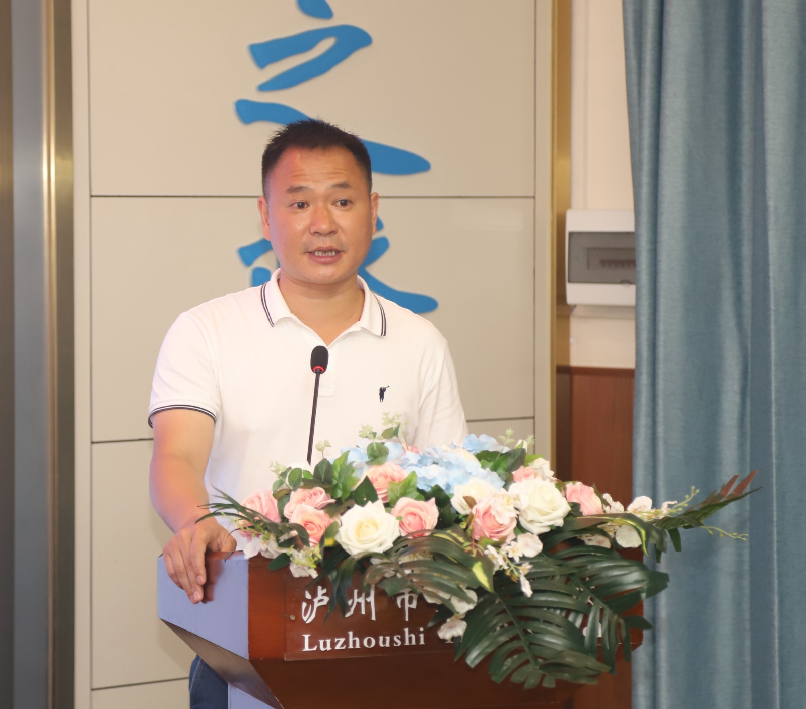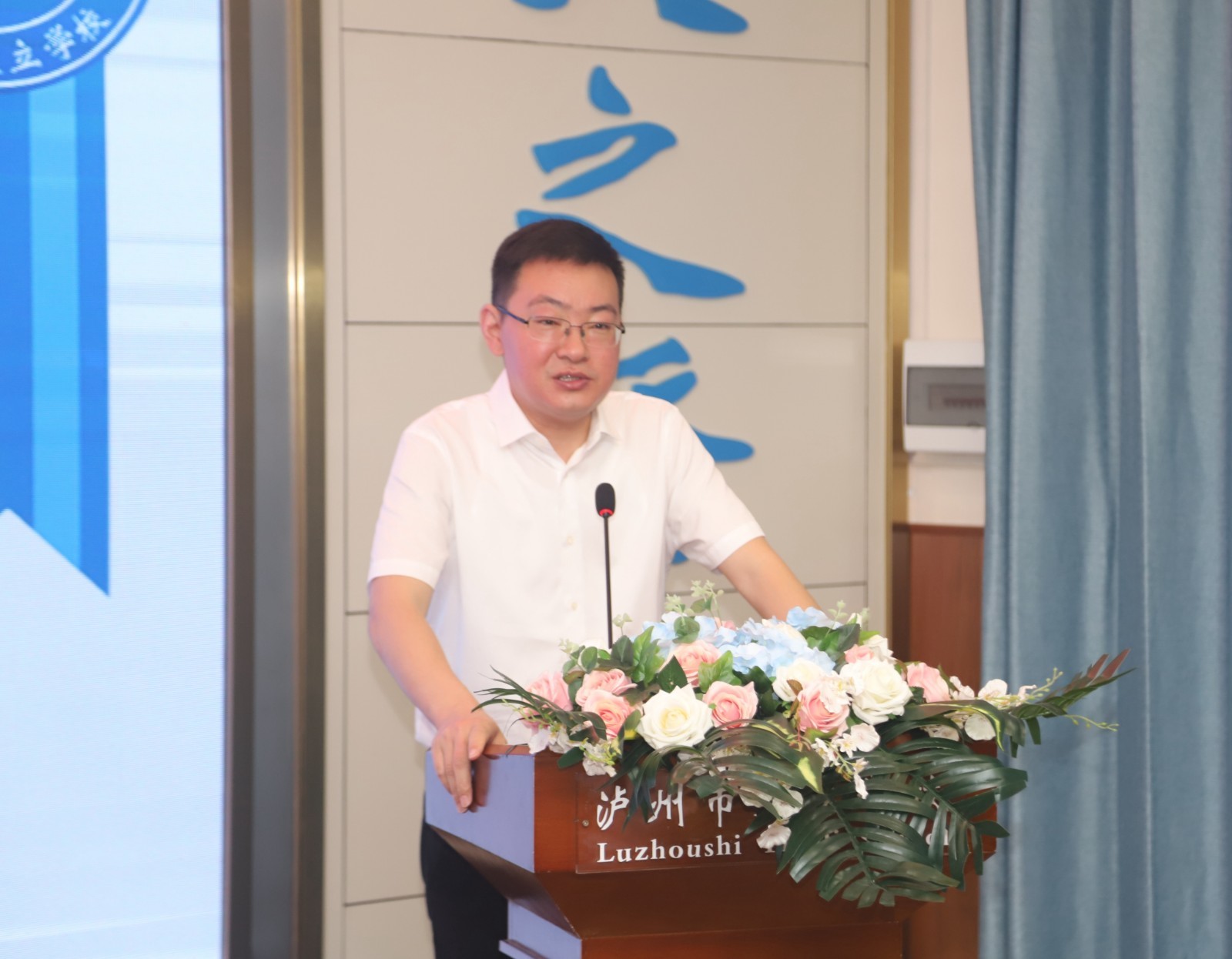 邱刚致辞,他介绍了泸州天立学校基本情况后,希望双方进一步深化院校合作成效,共同推进中医药文化教育,推动中医药文化繁荣。