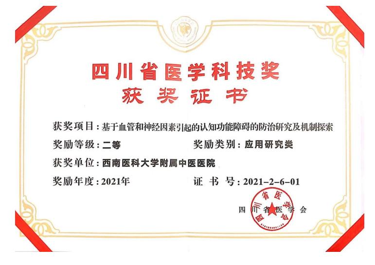 近日,四川省医学会2021年度“四川省医学(青年)科技奖”评选结果揭晓,我院麻醉科主任兼疼痛科副主任张英教授团队主研的“基于血管和神经因素引起的认知功能障碍的防治研究及机制探索”项目荣获四川省医学科技奖二等奖。