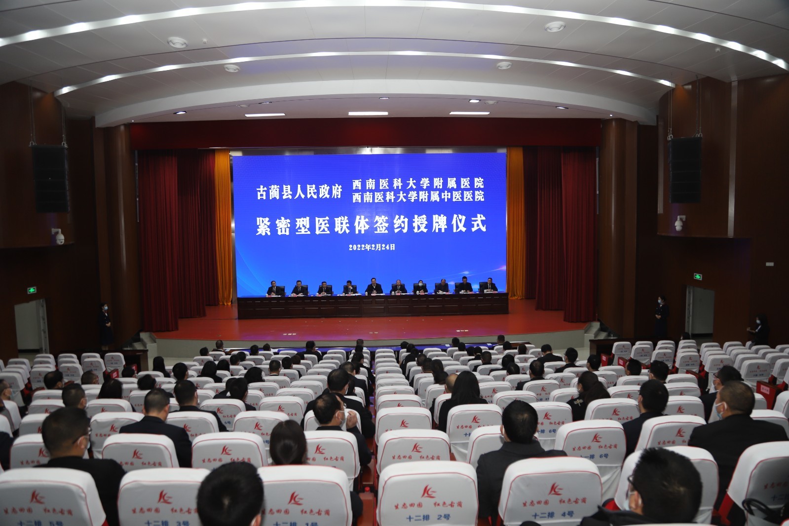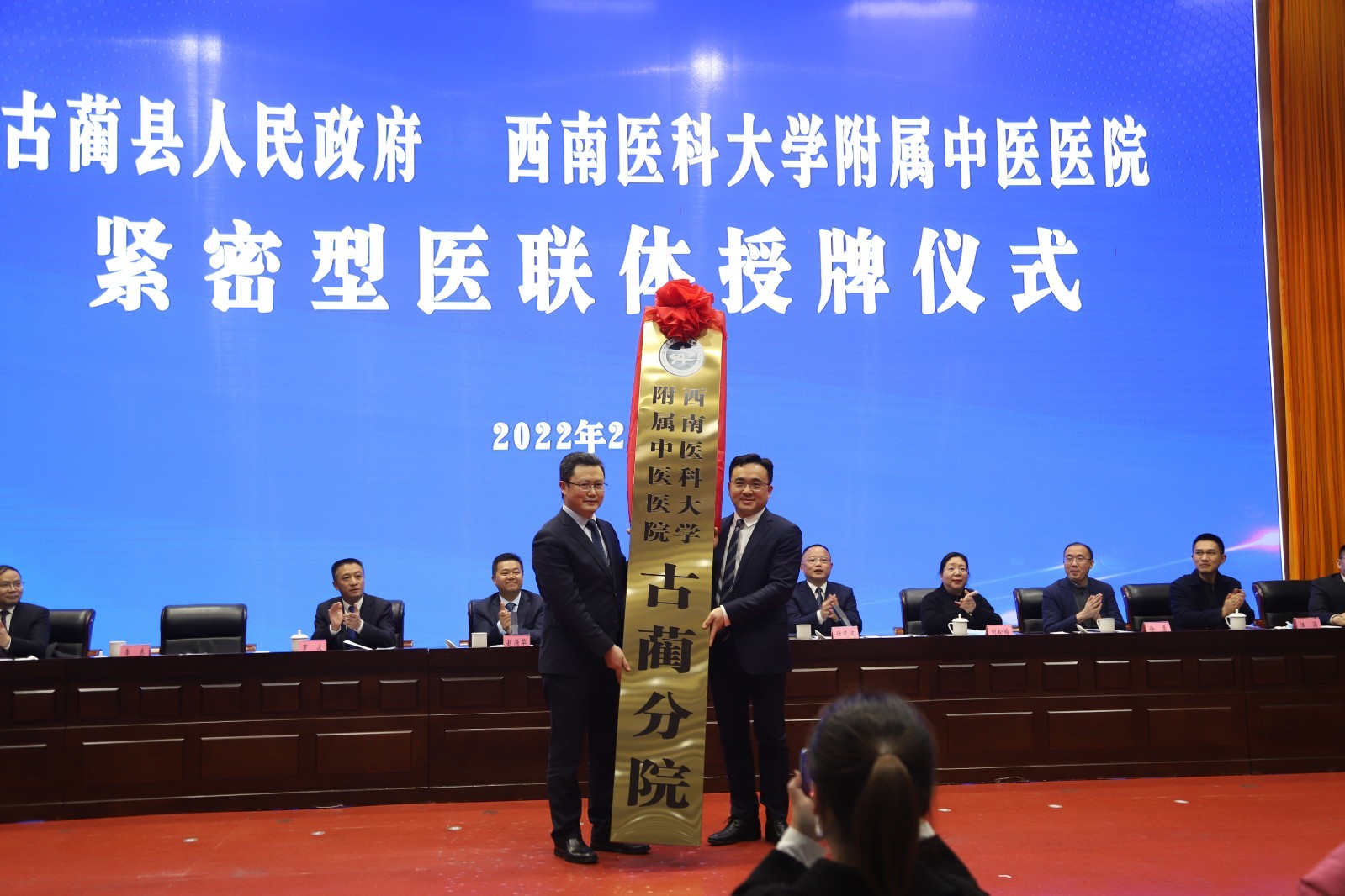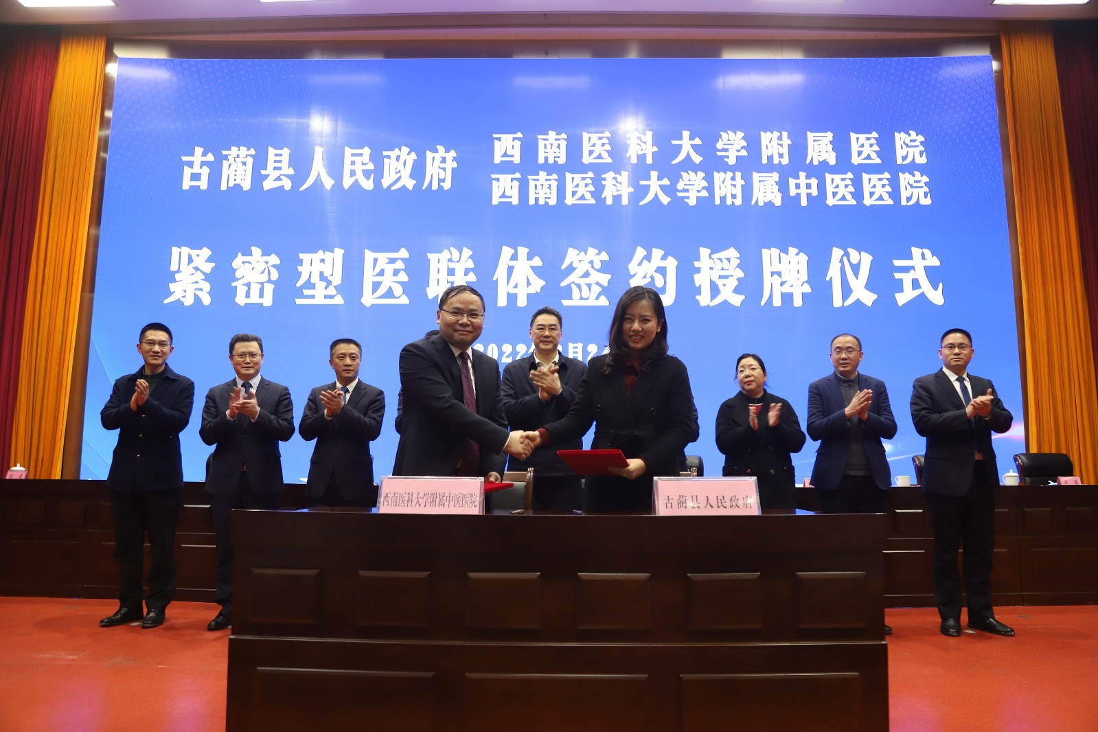 2022年2月24日,古蔺县人民政府与西南医科大学附属中医医院紧密型医联体签约仪式在古蔺举行。西南医科大学党委书记廖斌,泸州市卫生健康委副主任龙维平,古蔺县县委书记任晓波,县委副书记、县长赵源华,县人大党组书记、常委会主任刘松梅,县政协党组书记、主席罗波,我院党委书记李志、院长刘建等参加了仪式。仪式由赵源华主持。