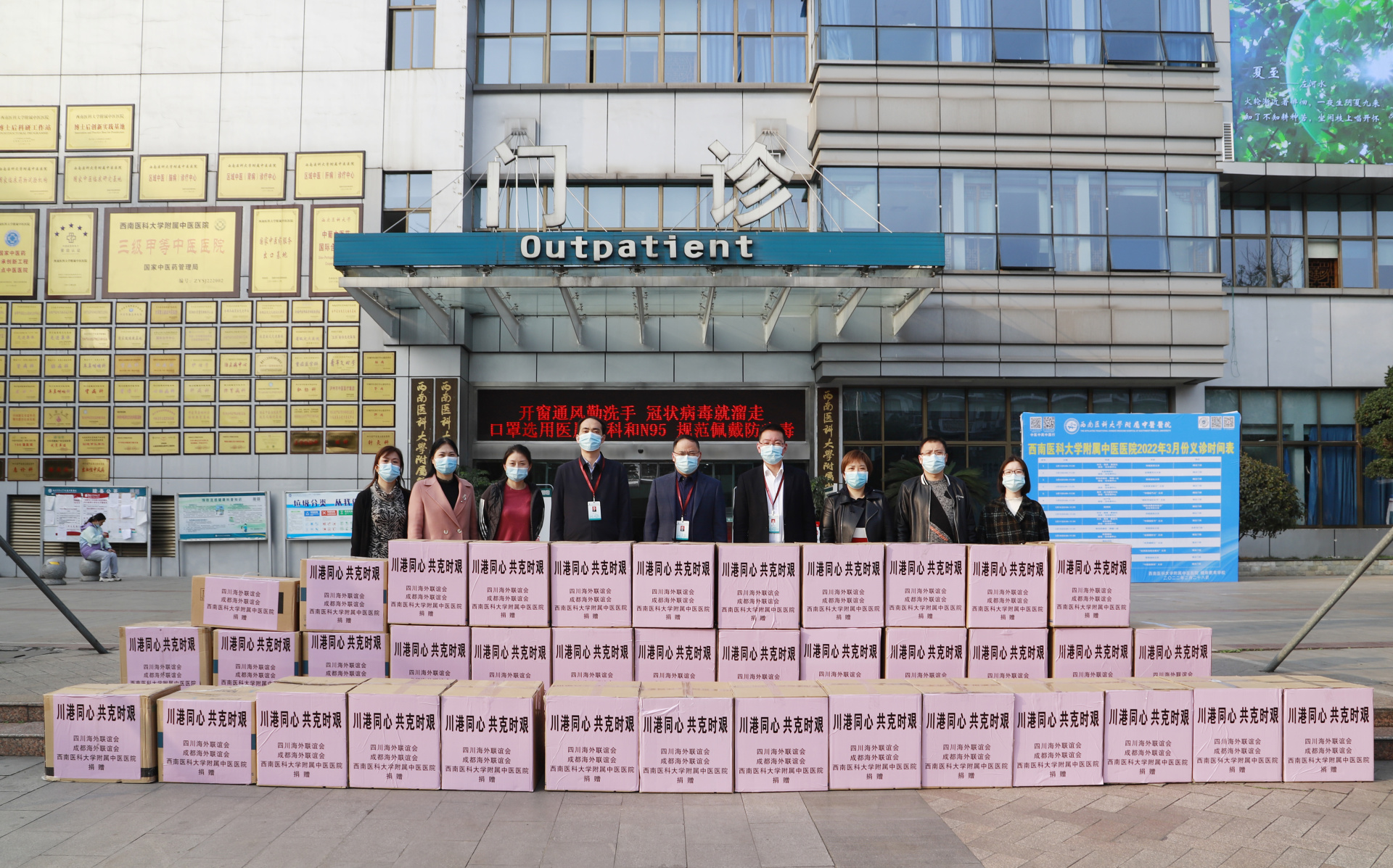 2022年3月4日,我院和四川海外联谊会、成都海外联谊会向香港四川社团总会捐赠了10000盒由我院牵头研制的“新冠1号”中药免煎颗粒以及一批医用外科口罩、医用颗粒物防护口罩(N95)、一次性使用防护服等共计100余万元的防疫物资。