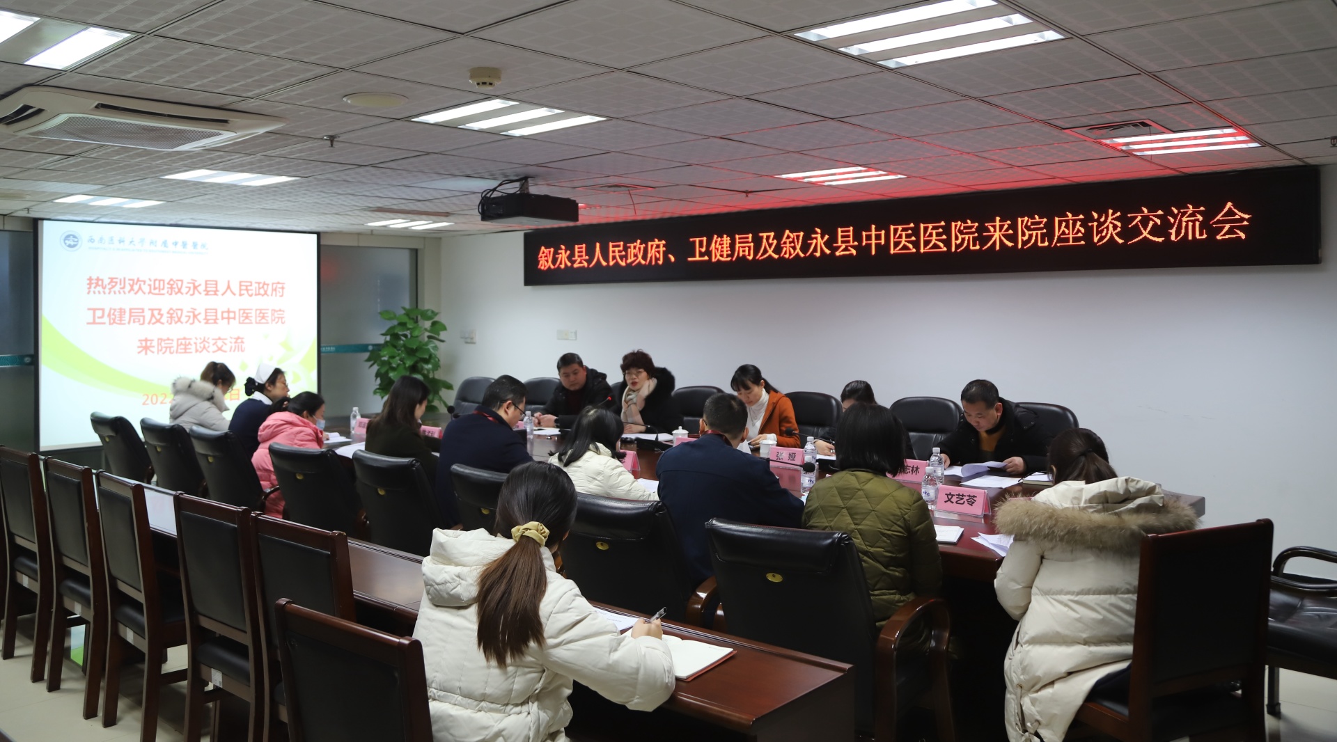 2022年2月11日,叙永县人民政府副县长王羽带领叙永县卫健局局长张娅、叙永县中医医院党委书记钟蕾、院长范志林、事业发展科科长庭健来院交流,我院党委书记李志,党委副书记、纪委书记徐茜及相关职能部门负责人参加了会议。会议由徐茜主持。