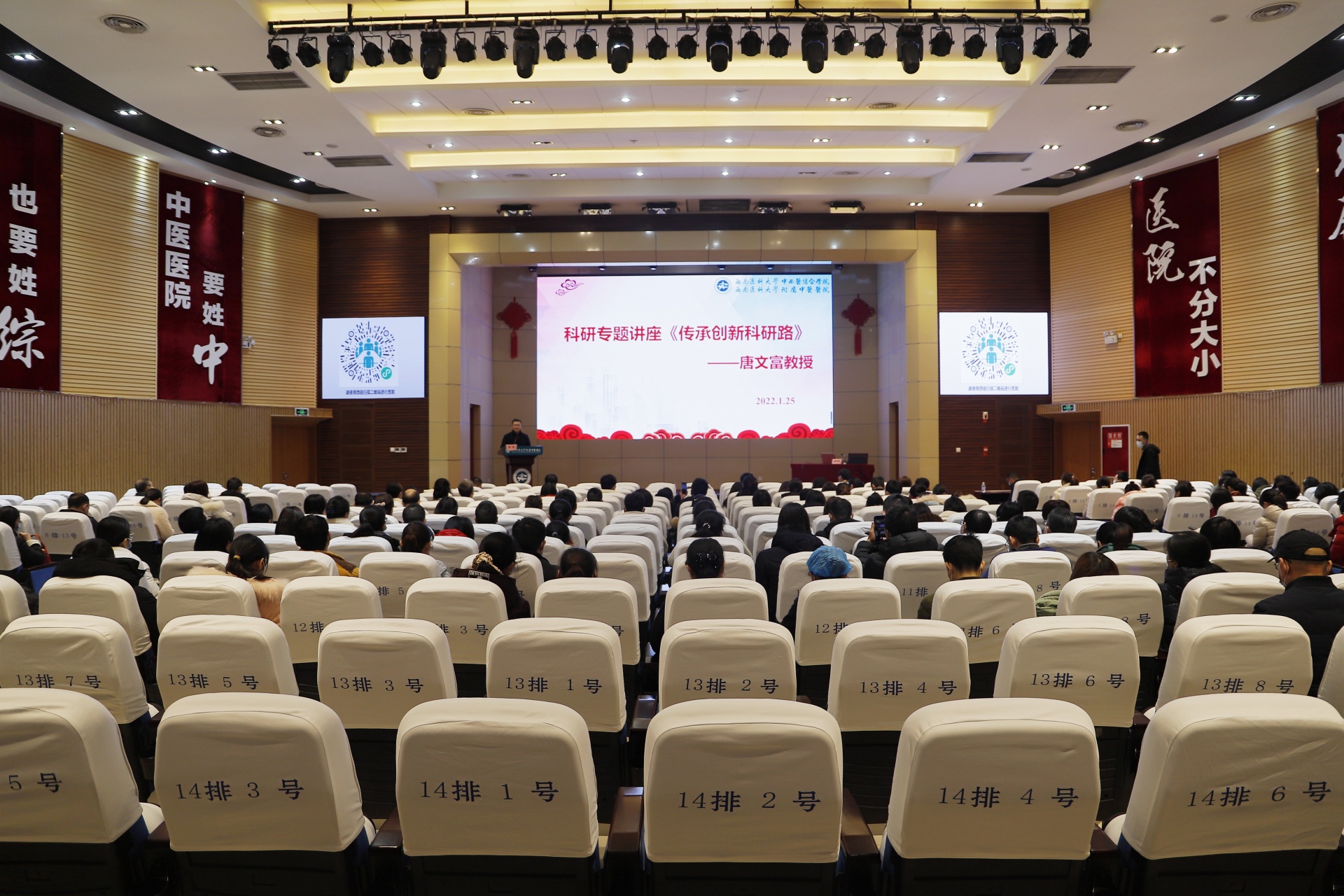 讲座中,唐文富教授从自己亲身经历出发,从如何做好中医药科研、如何凝炼科学问题、创新学术思想、撰写科研标书等方面分享了国自然申报经验。
