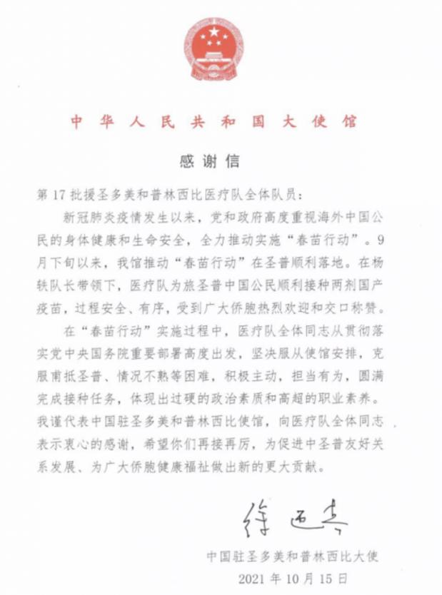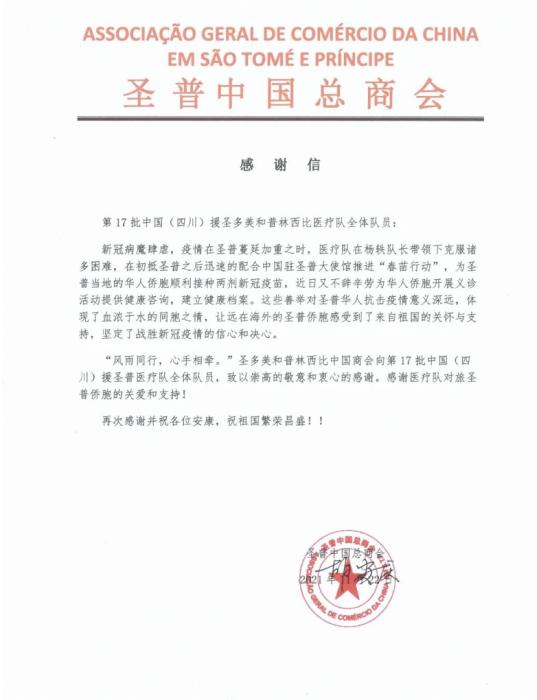 近日,我院针灸·推拿·康复科援外医师刘建伟所在的第17批援圣多美和普林西比医疗队先后收到中国驻圣多美和普林西比大使馆及圣普中国总商会感谢信,对援外队员在“春苗行动”及“外交为民 医暖人心——医疗队服务圣普华人义诊活动” 中的工作表示感谢。