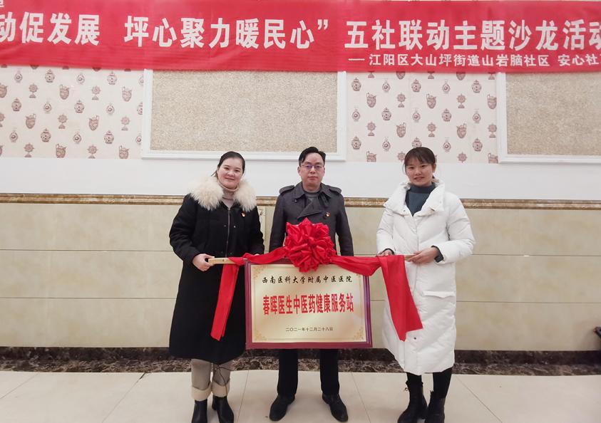 2021年12月28日,我院神经内科党支部与泸州市大山坪街道山岩脑社区党委举行了“春晖医生中医药健康服务站”授牌仪式。泸州市大山坪街道山岩脑社区党委书记李丹,我院党委副书记雷学举及神经内科党支部医护人员等参加了仪式。仪式由李丹主持。