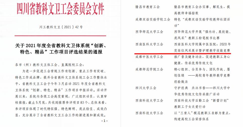 近日,我院组织开展的“2020年度岗位风采展示暨护理教学技能竞赛”荣获2021年度全省教科文卫体系统“创新、特色、精品”工作项目二等奖。