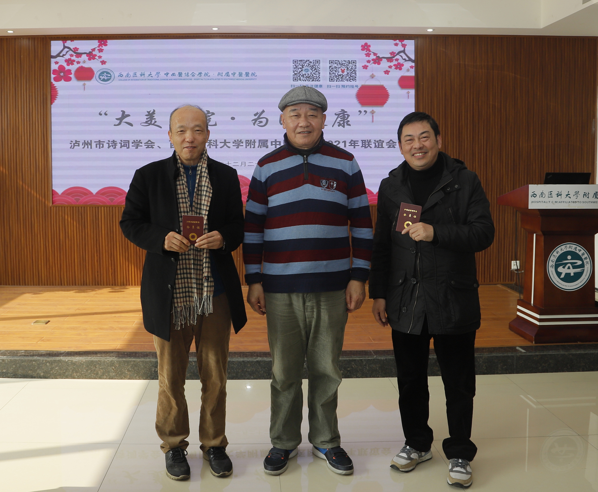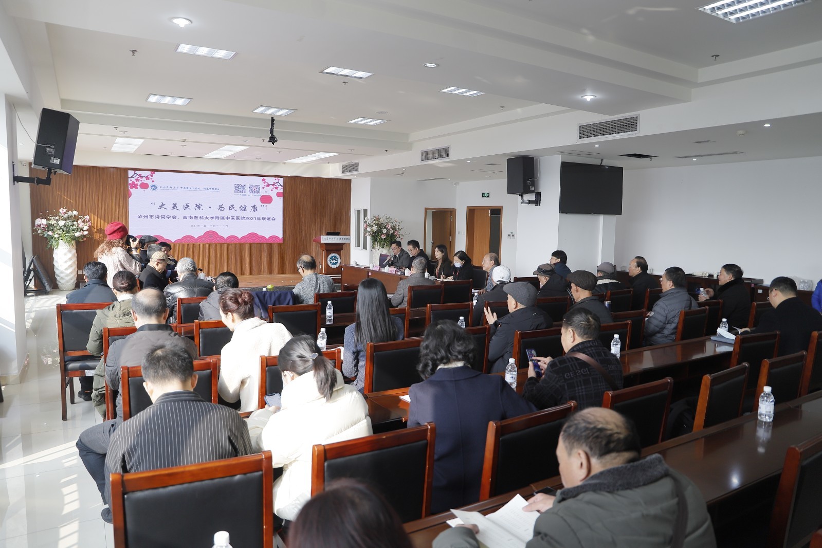 2021年12月22日,我院与泸州市诗词学会举行了以“大美医院·为民健康”为主题的2021年联谊会。泸州市诗词学会会长尹杰霖,泸州市社科联党组成员、副主席胡德明,泸州市二级巡视员、泸州市文联原主席虞潜,泸州市公路局原局长张永建等领导及30余名会员,医院党委副书记·纪委书记徐茜、党委副书记雷学举等领导及相关职能部门负责人参加了会议。会议由雷学举主持。