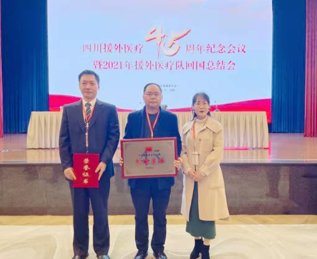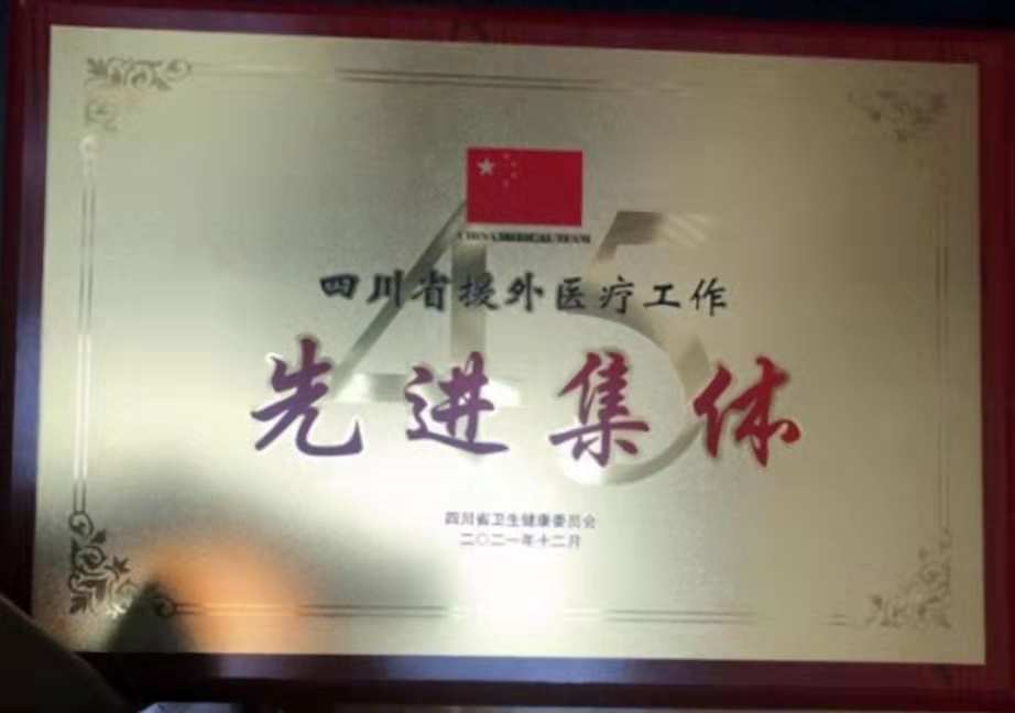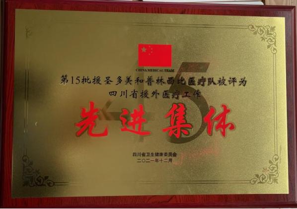 我院喜获“四川省援外医疗工作先进集体”,针灸·推拿·康复科潘小燕医生参加的第15批援圣多美和普林西比医疗队荣获“四川省援外医疗工作先进集体”,针灸·推拿·康复科马登尚医生荣获“四川省援外医疗工作先进个人”称号。