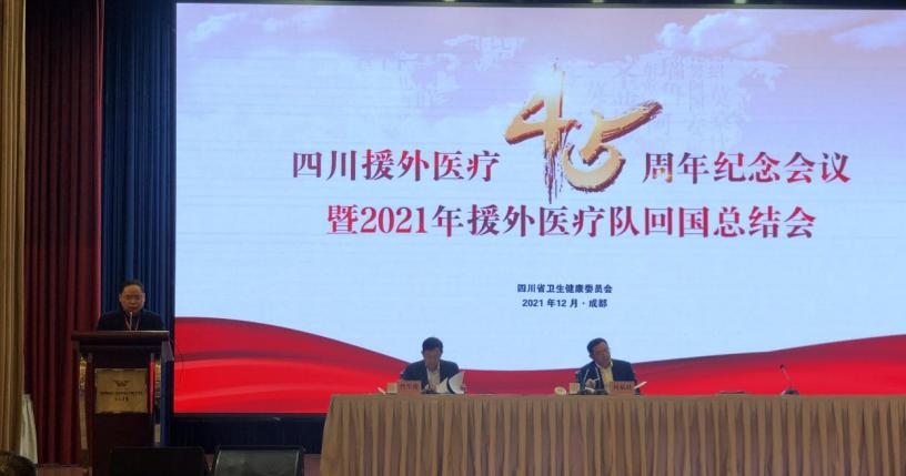 2021年12月14日,四川援外医疗45周年纪念会议暨2021年援外医疗队回国总结会在成都召开。四川省卫生健康委党组书记敬静、主任何延政及相关处室负责人,各地市州卫健委、派员单位代表及援外医疗队队员代表等近100人参加会议。会议由四川省卫生健康委党组成员、省保健办专职副主任、一级巡视员曾华俊主持。