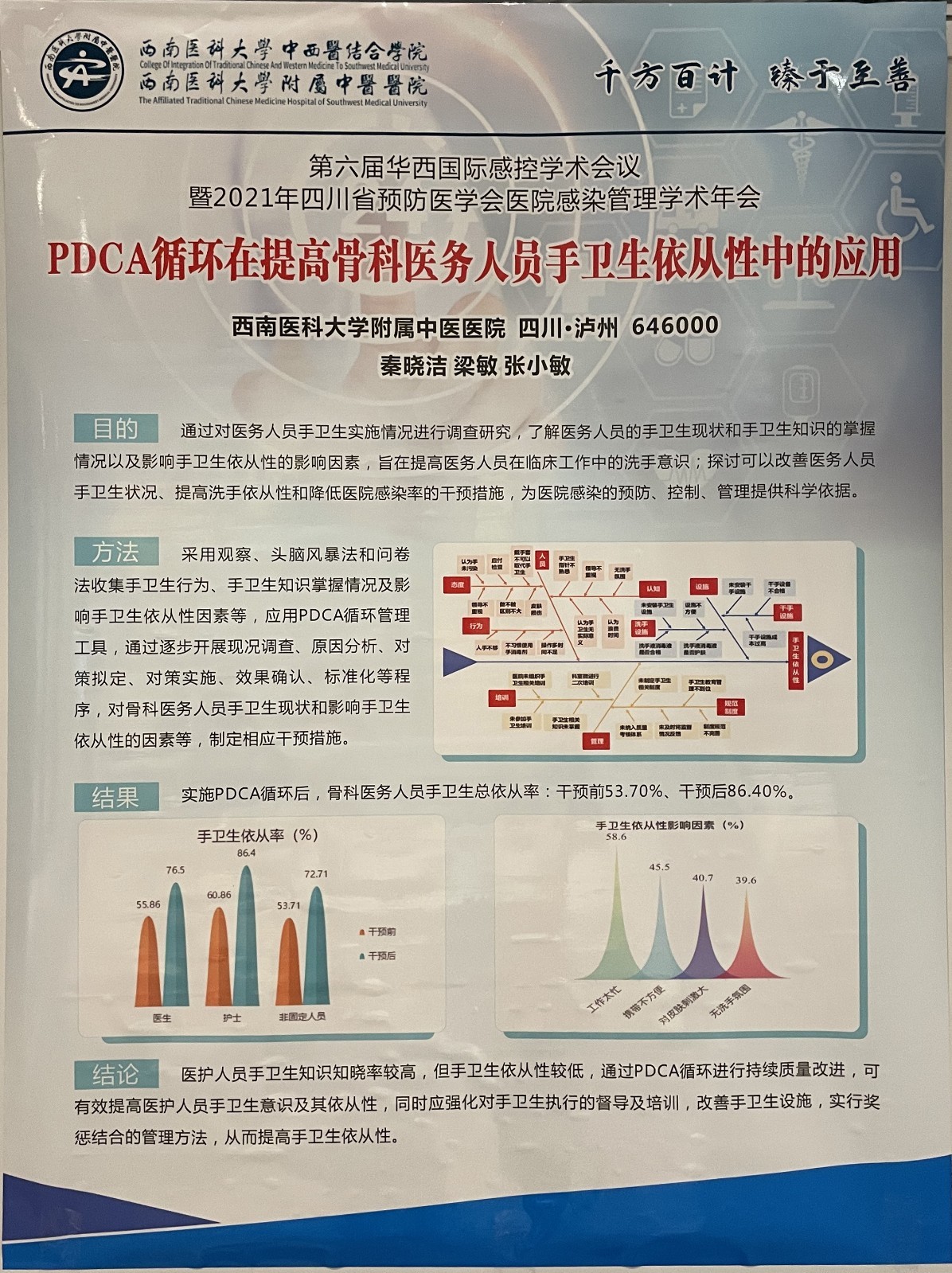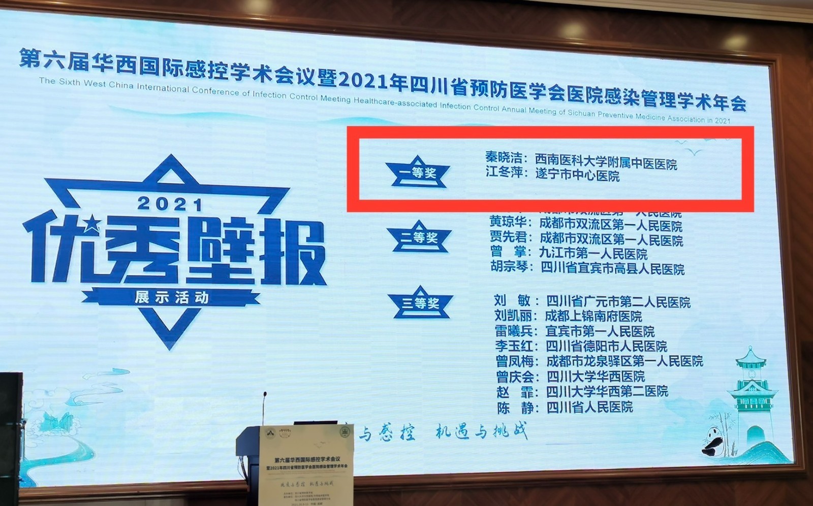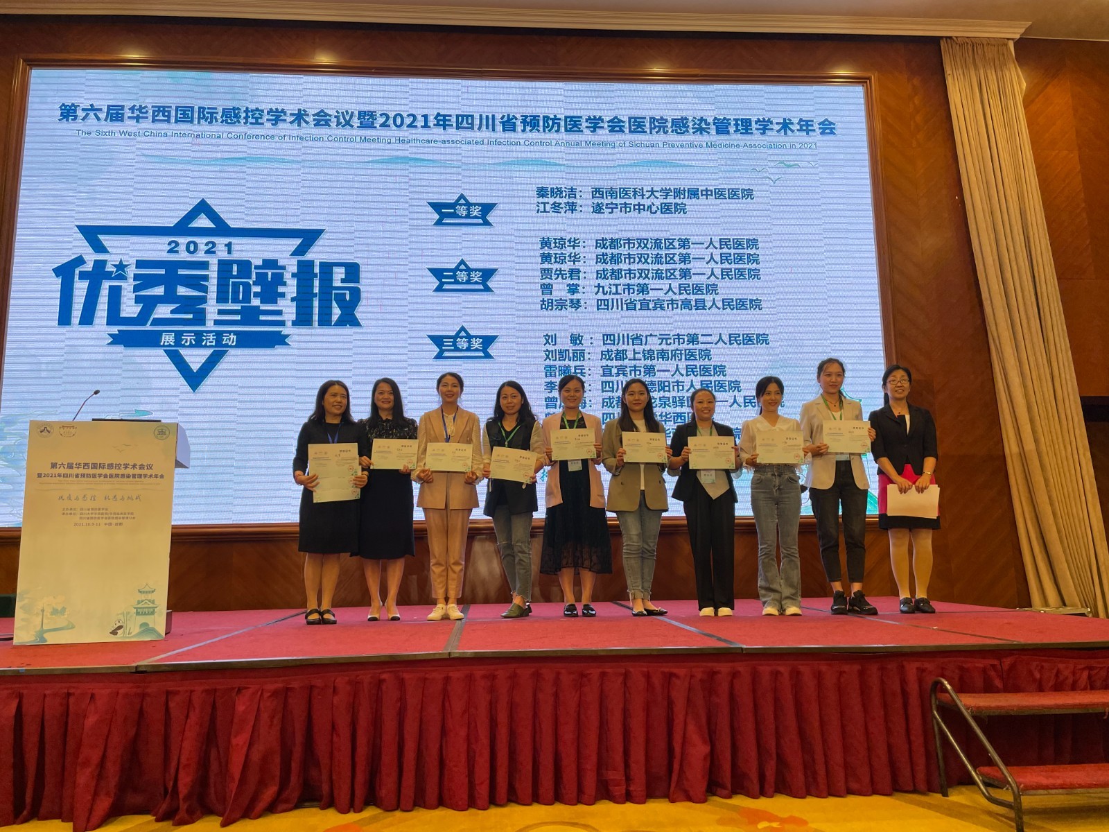 2021年10月9-11日,第六届华西国际感控学术会议暨2021年四川省预防医学会医院感染管理学术年会在成都举行,我院院感护士秦晓洁荣获壁报比赛一等奖。
