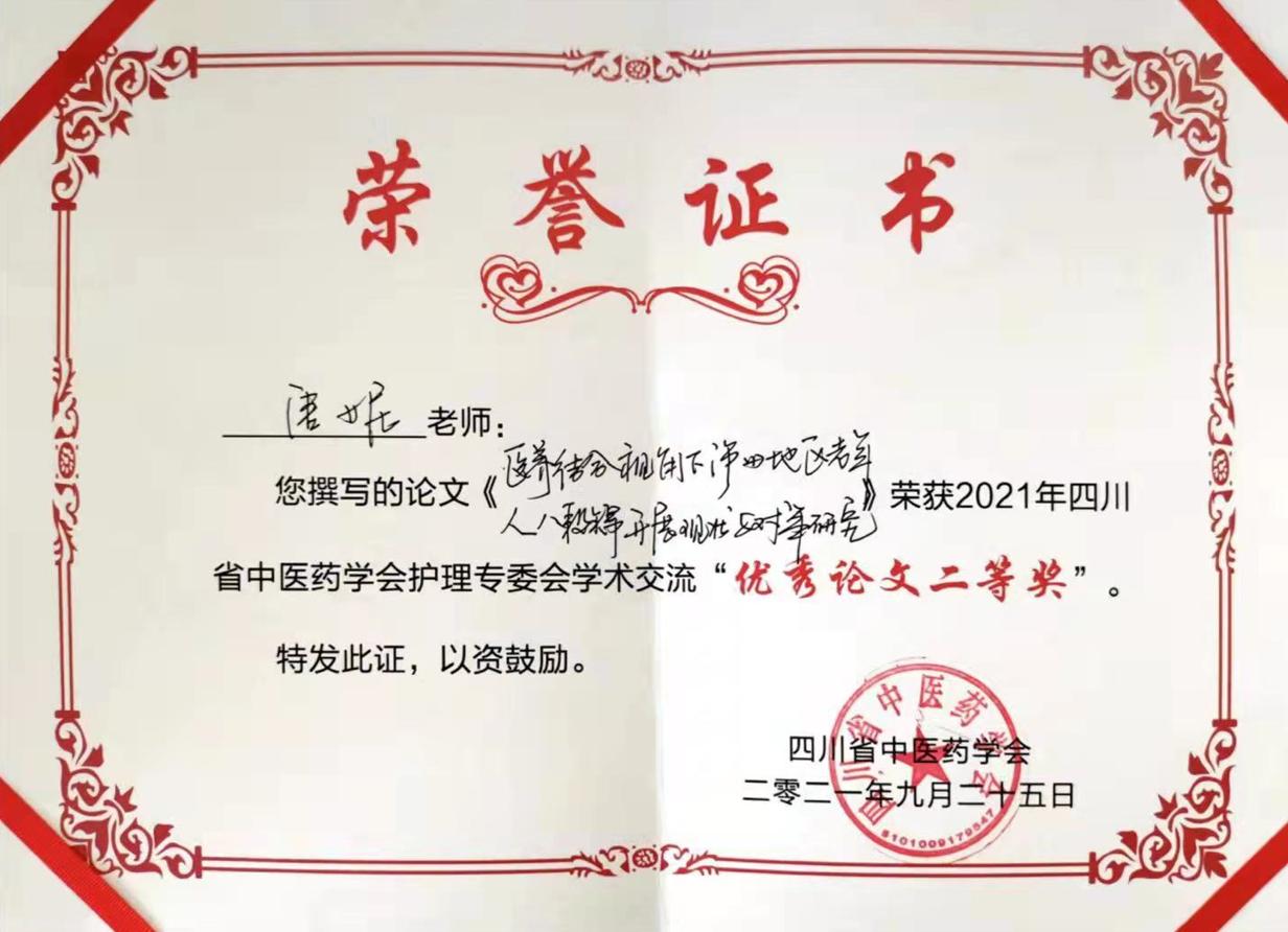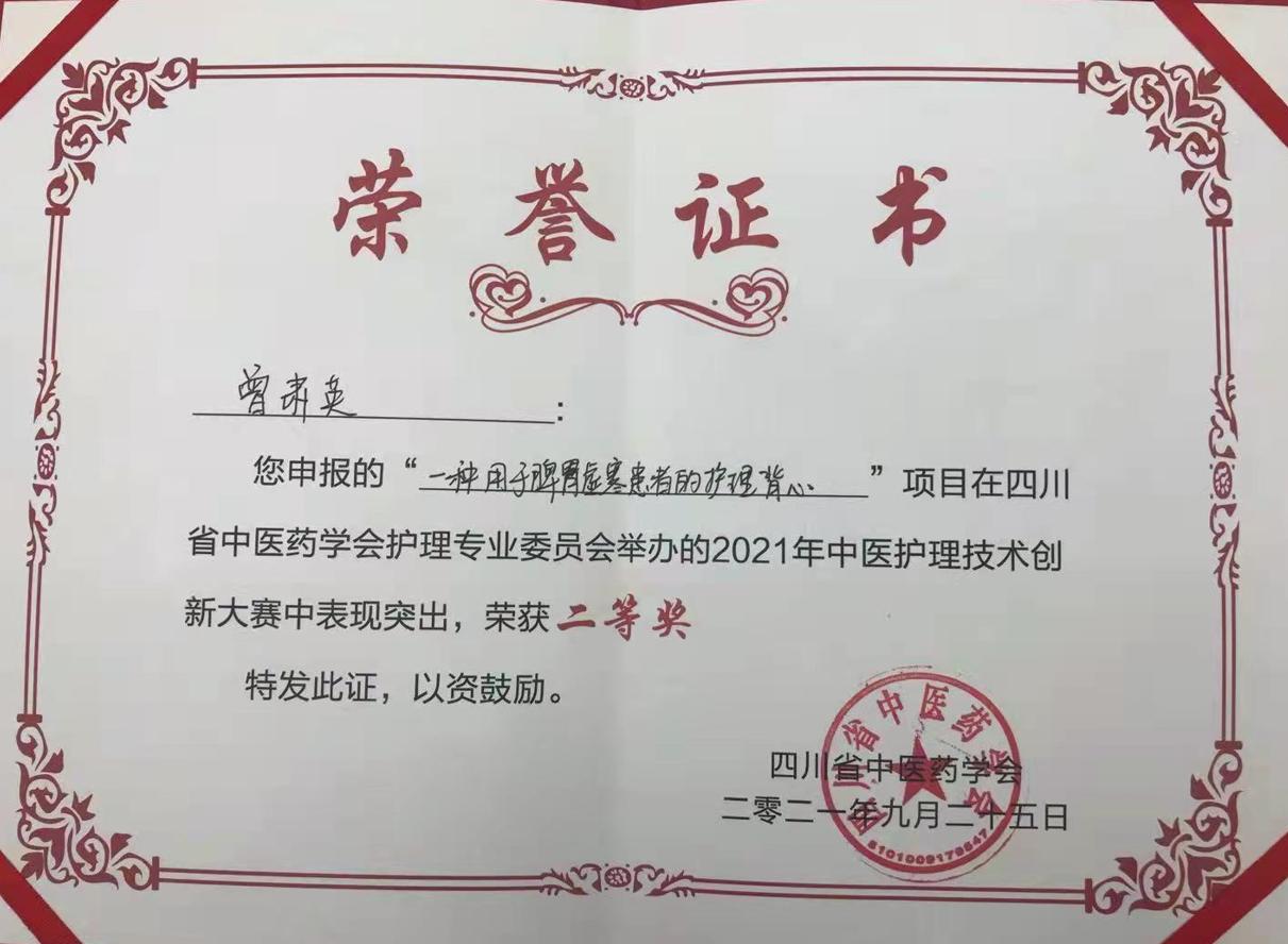 9月23-25日,四川省中医药学会护理专委会2021年中医护理学术年会暨中医传承与创新能力培训(第二期)在成都召开,来自四川省内10余家医疗机构的选手分别参加了论文交流和第二届中医护理技术创新大赛,我院胸心外科护士长唐妮荣获大会交流二等奖,普外•疝与腹壁外科护士长邓淑霞、脾胃•风湿免疫科副护士长曾肃英荣获中医护理技术创新大赛二等奖。