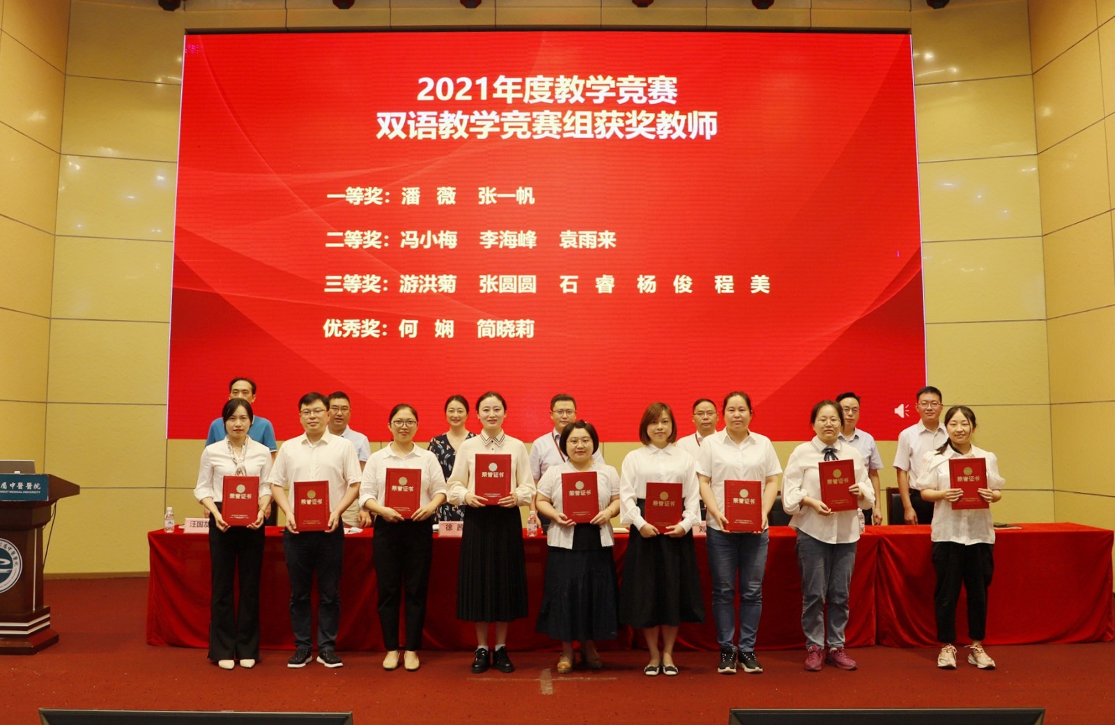 2021年双语教学竞赛获奖教师:潘薇、张一帆、冯小梅、李海峰、袁雨来、游洪菊、张圆圆、石睿、杨俊、程美、何娴、简晓莉