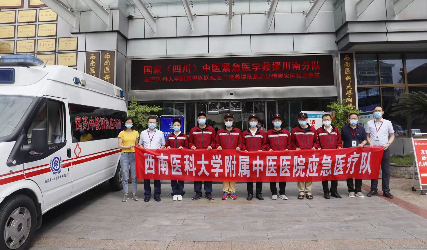 2021年9月17日11:00,由我院急诊科刘操副教授、骨伤科石厚银副教授、呼吸内科李修元主治医师、中医经典病房高立主治医师、药剂科彭勇中药师、赖雪茹中药师及救护车师傅何小冲、曹吉8人组成的第二批医疗救援队驾驶医院流动应急智能中药房车,携带大批中药制剂、救援应急物资等赶赴泸县地震灾区。