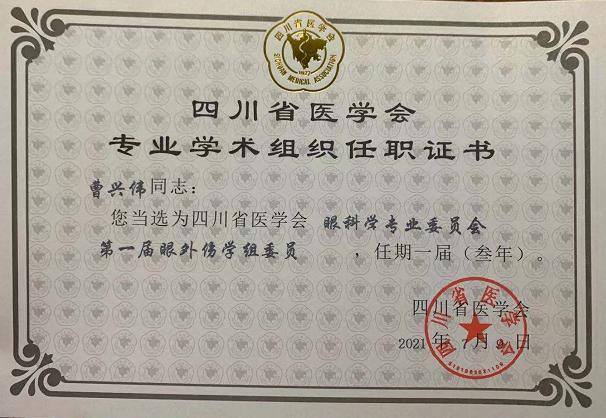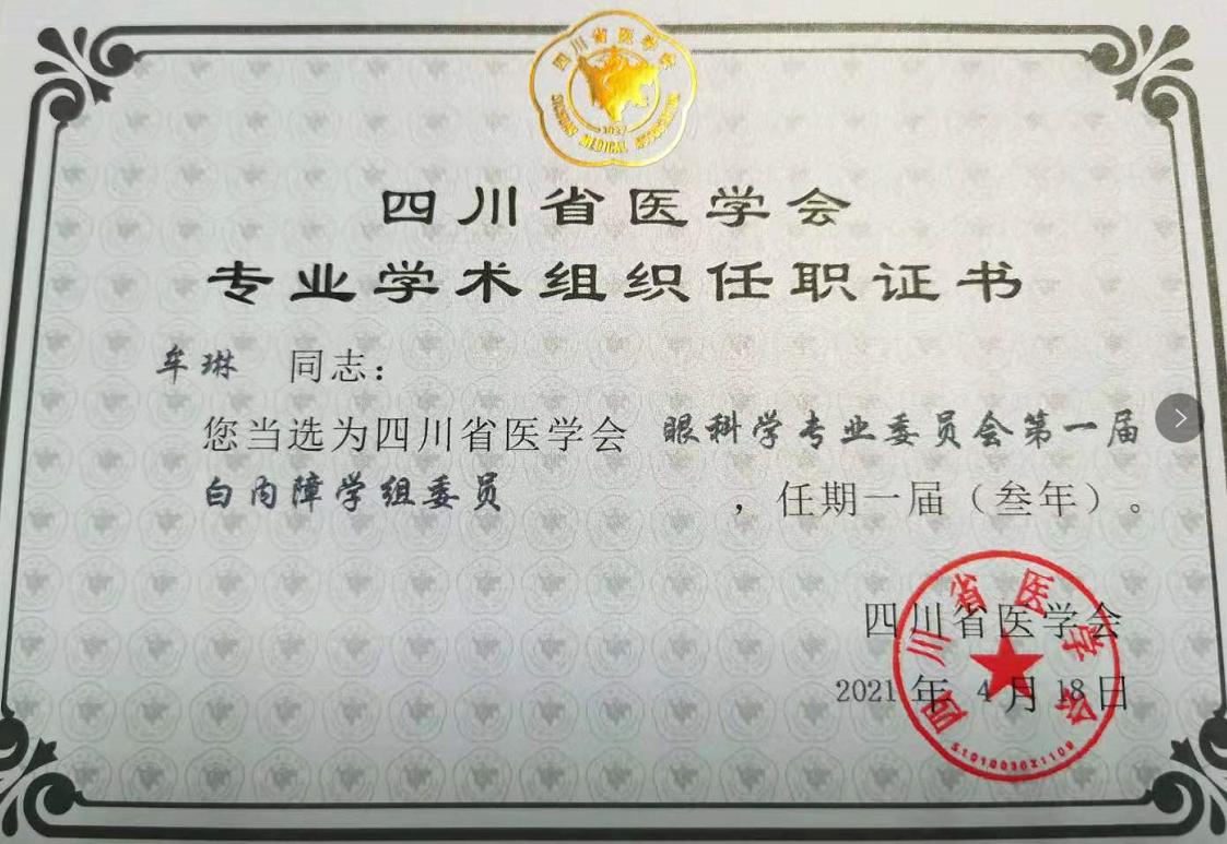 近日,四川省医学会眼科学专业委员会成立白内障学组和眼外伤学组首届选举大会在成都召开,我院眼科主任牟琳教授当选为白内障学组委员,曹兴伟副教授当选为眼外伤学组委员。