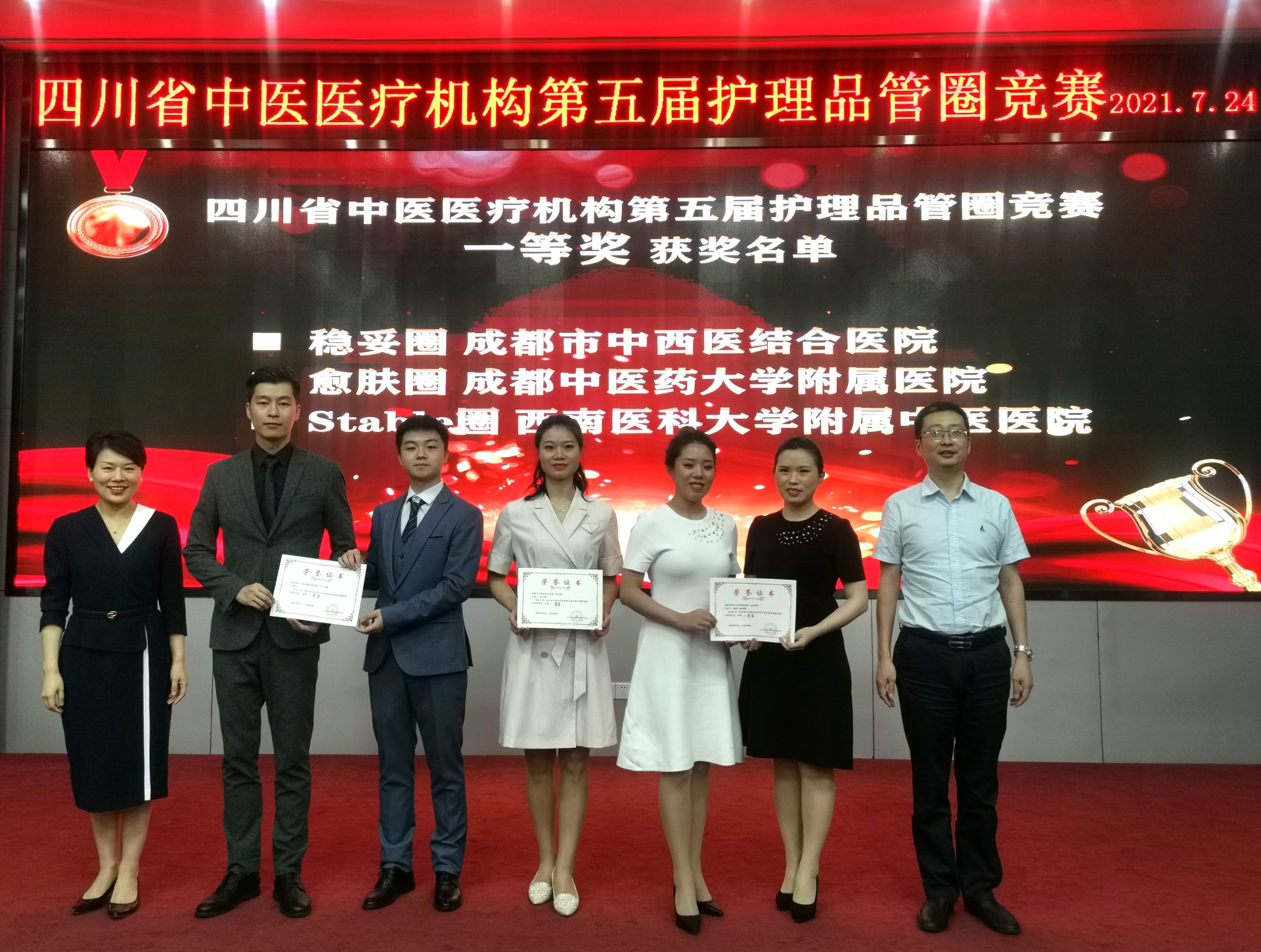 7月24日,四川省中医医疗机构第五届护理品管圈竞赛在成都举行,由我院护理部组织,城北急诊科黄剑飞、骨伤科(脊柱·肿瘤二组)代鑫杰展示的“Stable圈——提高蝮蛇咬伤患者中药透皮联合拔罐排毒疗法的规范率”在川渝地区27个参赛项目中脱颖而出,荣获一等奖。