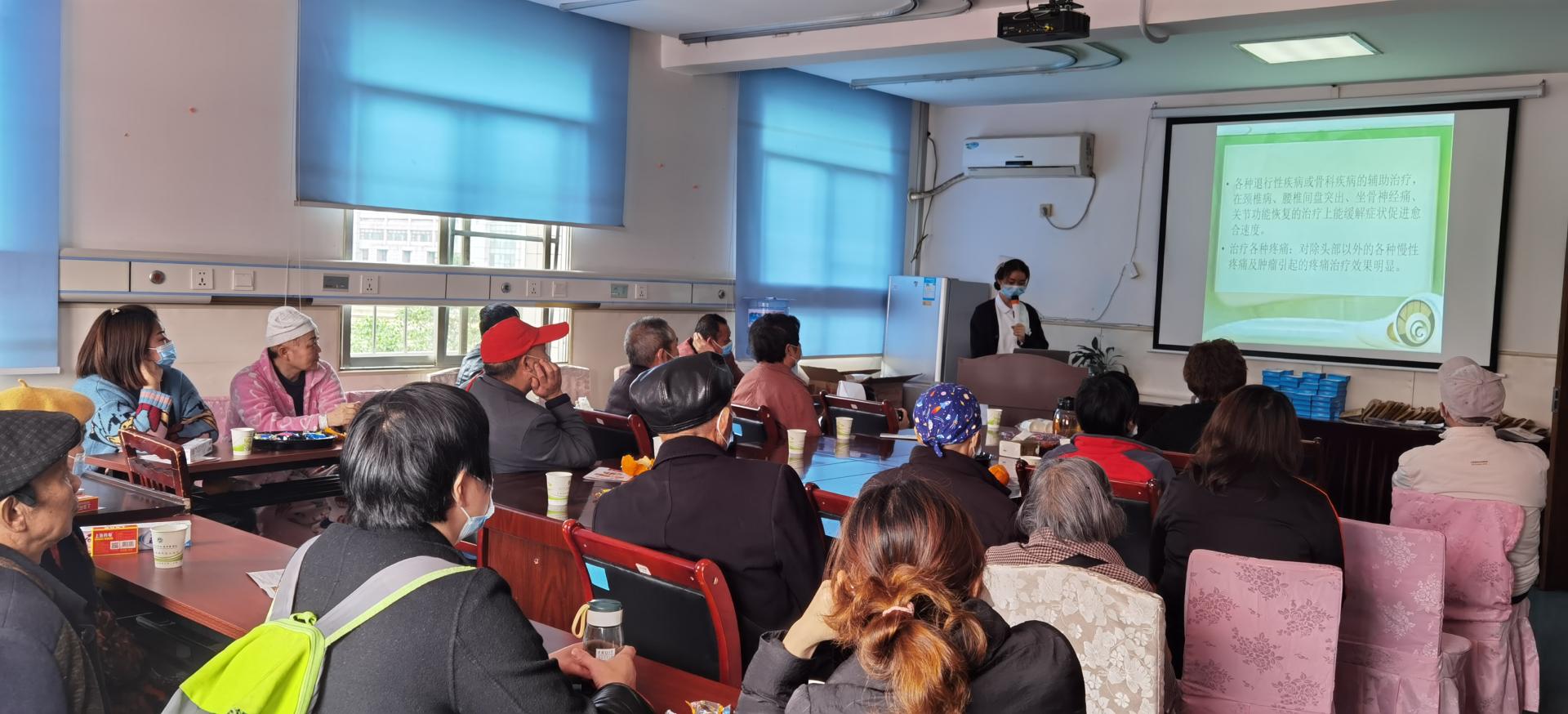 义诊现场,护理部部长李素莲作了《骨质疏松症的预防》专题讲座;医护人员为40余名老人开展了义诊及健康咨询,进行了体质辨识、耳穴贴压、火龙罐、虎符铜砭刮痧、穴位贴敷、艾灸等中医特色技术体验;相关人员现场教学了心肺复苏及八段锦养生操。