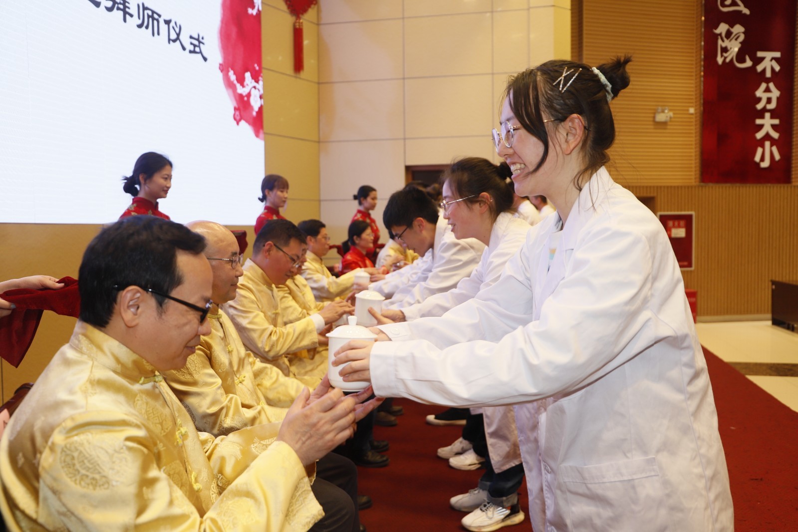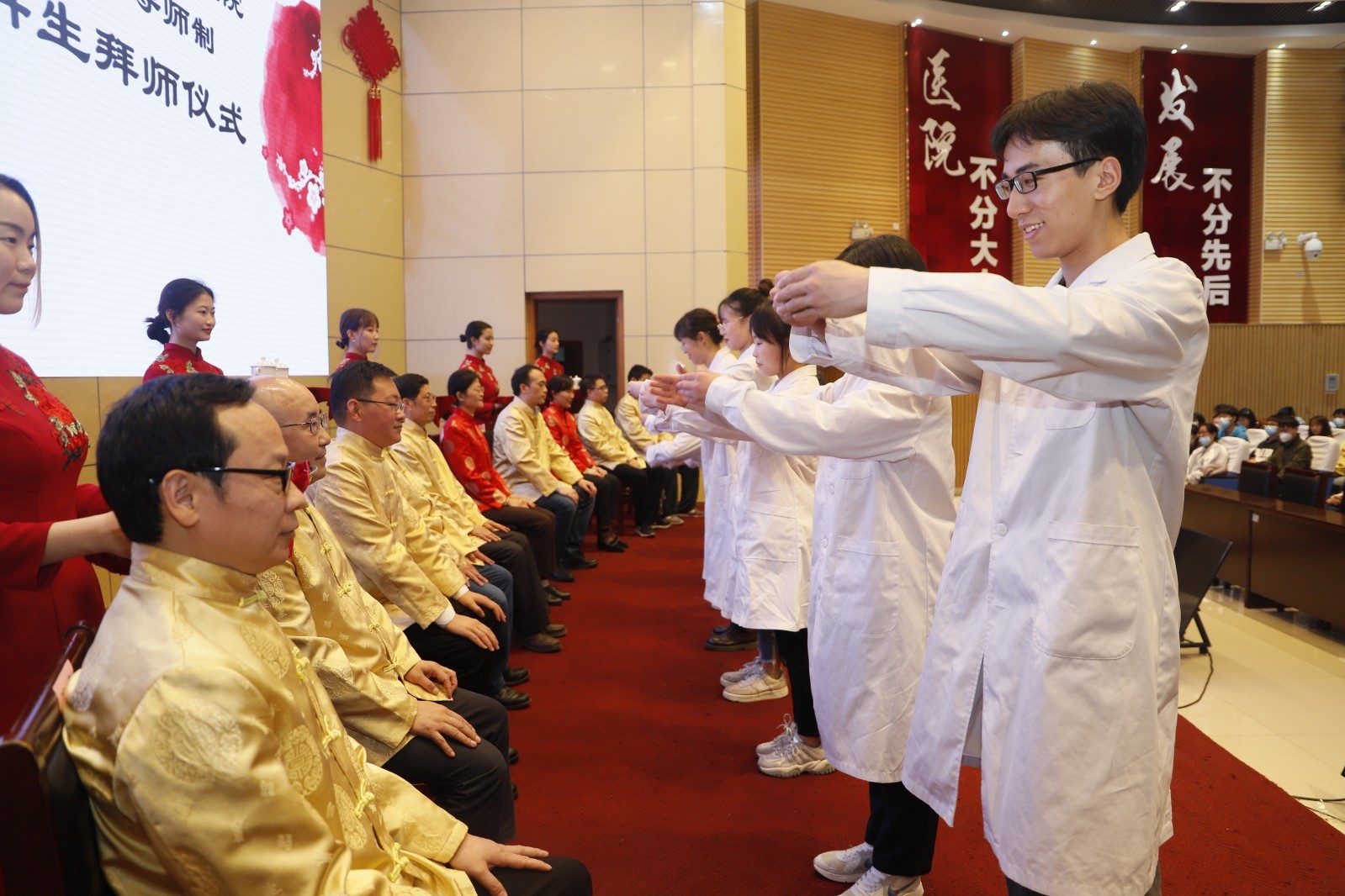 随后,2018级、2019级、2020级学生代表先后向导师行三拜之礼、奉拜师茶,导师们向学生赠送了中医经典书籍。