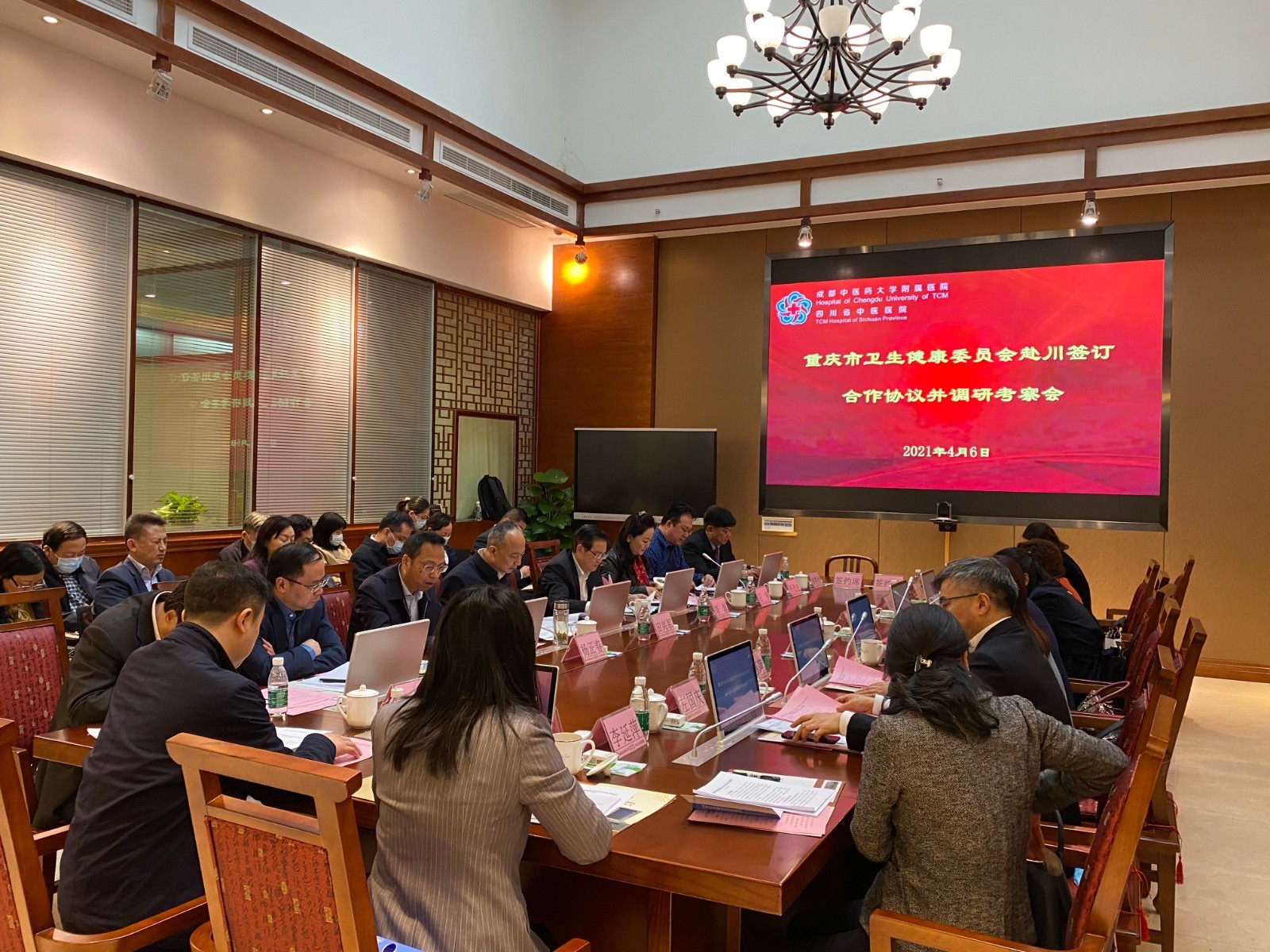 2021年4月6日,由四川省中医药管理局、重庆市卫健委牵头组织的国家中医临床研究基地建设项目合作协议签约仪式在成都举行,四川省中医药管理局党组书记、局长田兴军,重庆市卫生健康委员会党委委员、副主任邓莉,我院院长刘建以及成都中医药大学、四川省中医医院、重庆市中医医院、重庆市北碚区中医医院等领导参加了会议。会议由四川省中医药管理局二级巡视员杨正春主持。