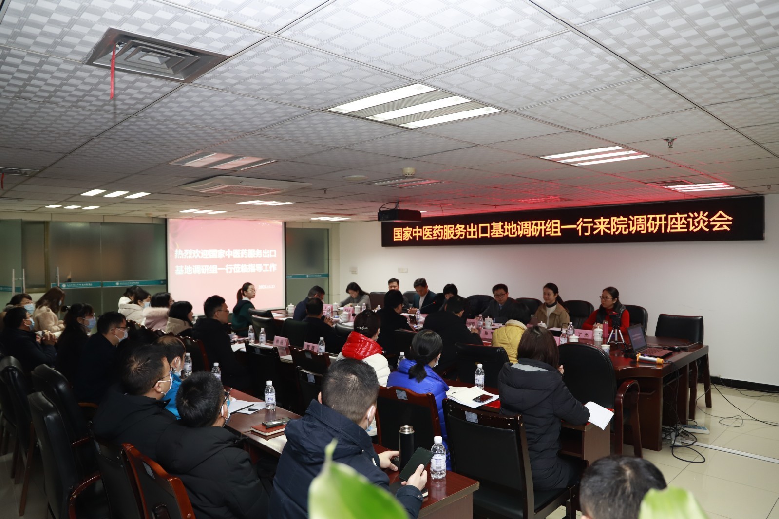 2020年12月23日,国家中医药服务出口基地调研组组长宋欣阳一行莅临我院调研中医药服务出口基地工作开展情况,四川省中医药管理局对外合作处处长曾琳,泸州市政协党组成员、副主席李锋,市卫健委党组书记、主任涂曲平,市商务和会展局党组成员、市贸促会专职副会长张伟,我院党委书记李志、副院长徐厚平等领导,基地合作企业代表及医院相关职能部门负责人参加了会议。会议由曾琳主持。